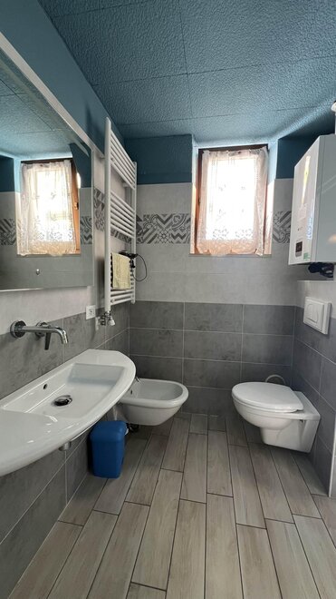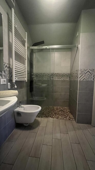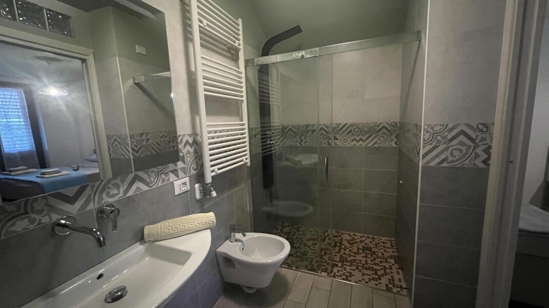 Triple bedroom and comfortable bathroom with floor-level shower.Bed distribution
