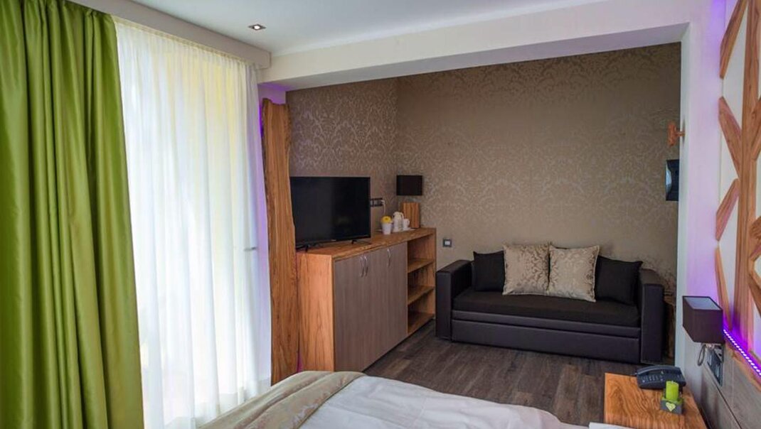 The new 45 m² "AKTIV " APARTMENT is the ideal solution in terms of space and independence, but with all the comforts and services of the hotel included. It has 1 double room, a living space with a sofa bed, a kitchenette and a bathroom with shower.