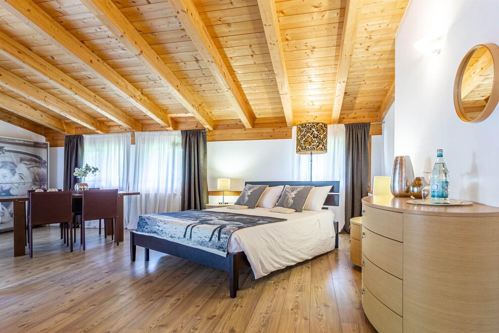 The particular size of this room plays an important role in the contrast between the bright and warm shades of the bleached wooden floor and the wenge, the king size bed and the multipurpose table, placed in front of the big window and glass door that lead to a wide roof patio plainly furnished with wooden detail,s from which you will be delighted with a spectacular view of Vetriolo Terme and Cima Panarotta.