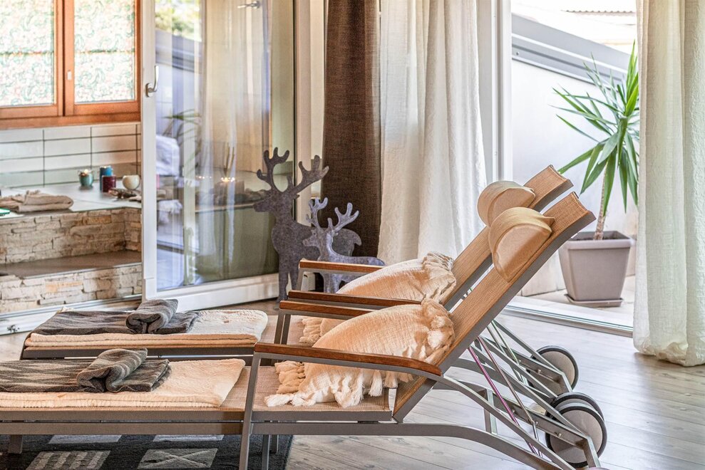 In the middle of the room two steamer chairs , on which you can unwind, reading, listening to music or watching TV, will give you sweet moments of relax. The bathroom is surprising: its peculiarity comes from the ingenious intertwining of colours and materials: one area boasts a proper bathroom with warm orange walls, the other one boasts a sunken tub where the glass floor shows a collection of fine wines which proves a deep love for the Trentino viticultural tradition.Suite Open Space Monticelli The particular size of this room plays an important role in the contrast between the bright and warm shades of the bleached wooden floor and the wenge, the king size bed and the multipurpose table, placed in front of the big window and glass door that lead to a wide roof patio plainly furnished with wooden detail,s from which you will be delighted with a spectacular view of Vetriolo Terme and Cima Panarotta. In the middle of the room two steamer chairs , on which you can unwind, reading, listening to music or watching TV, will give you sweet moments of relax. The bathroom is surprising: its peculiarity comes from the ingenious intertwining of colours and materials: one area boasts a proper bathroom with warm orange walls, the other one boasts a sunken tub where the glass floor shows a collection of fine wines which proves a deep love for the Trentino viticultural tradition.