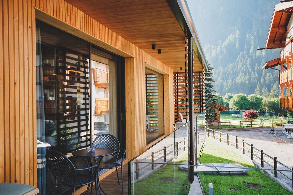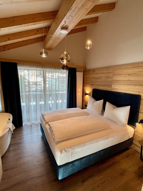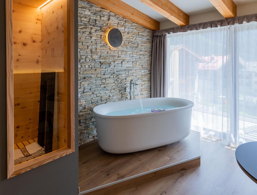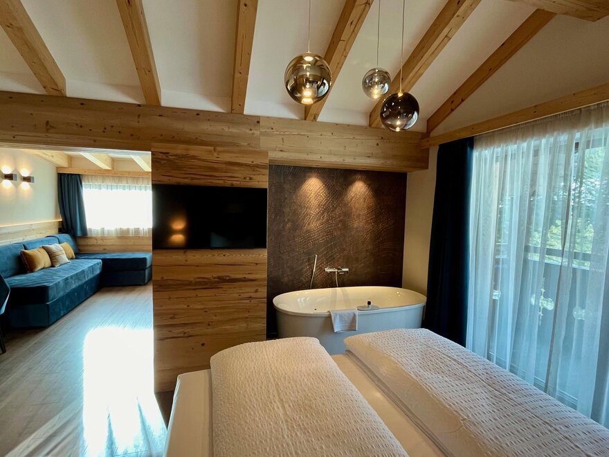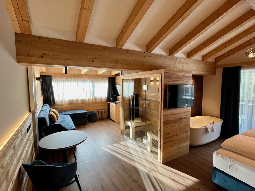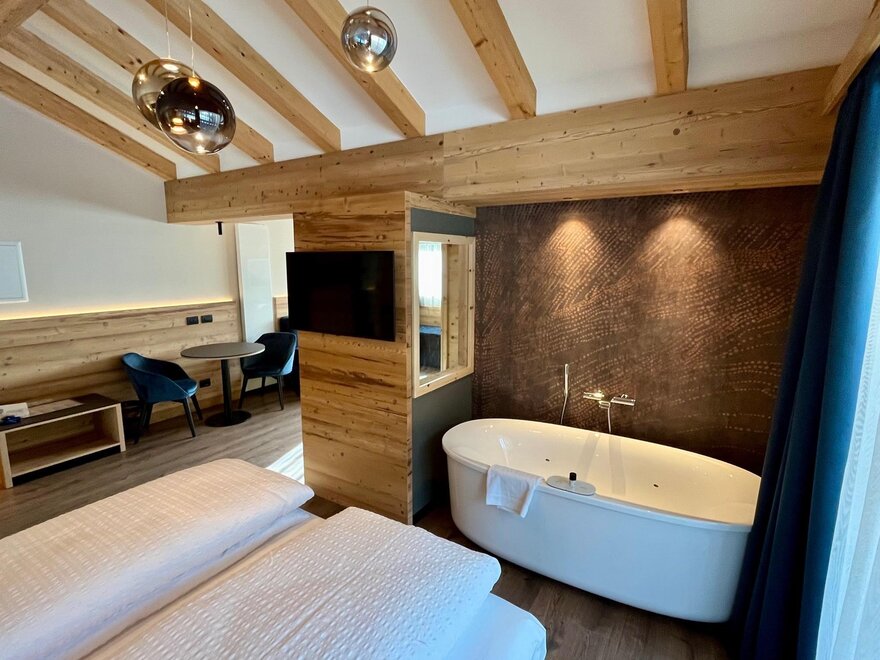 The brand new Wellness Suites are furnished with precious larch wood, featuring large and comfortable beds, infrared sauna, Jacuzzi tub, TV, and safe. The south-facing balcony offers a stunning view of the Catinaccio D'Antermoia.