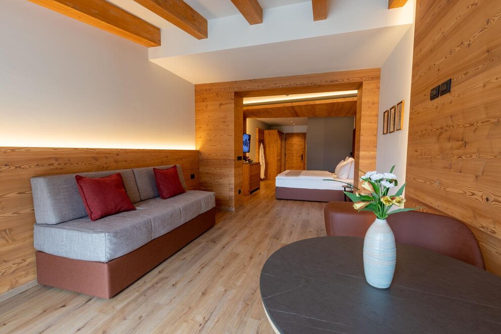 The brand new Junior Suite Wellness Sassolungo are extremely spacious rooms, featuring a Jacuzzi tub and infrared sauna in the room. A cozy living area with comfortable sofas is ideal for a moment of relaxation after a day in our mountains. The balcony offers a stunning view of the Sassolungo range.