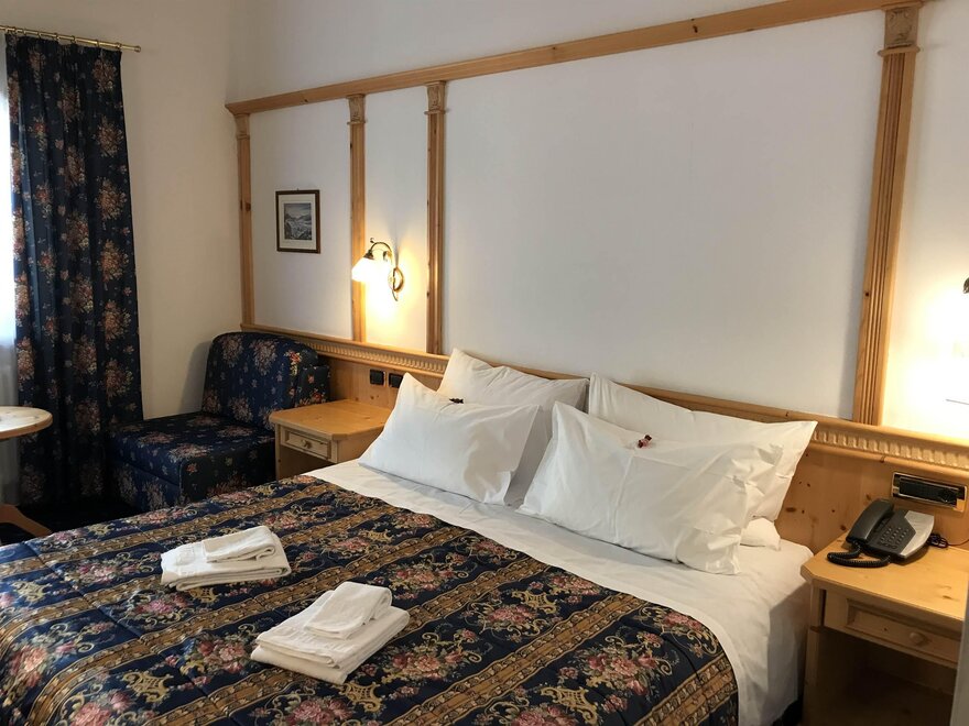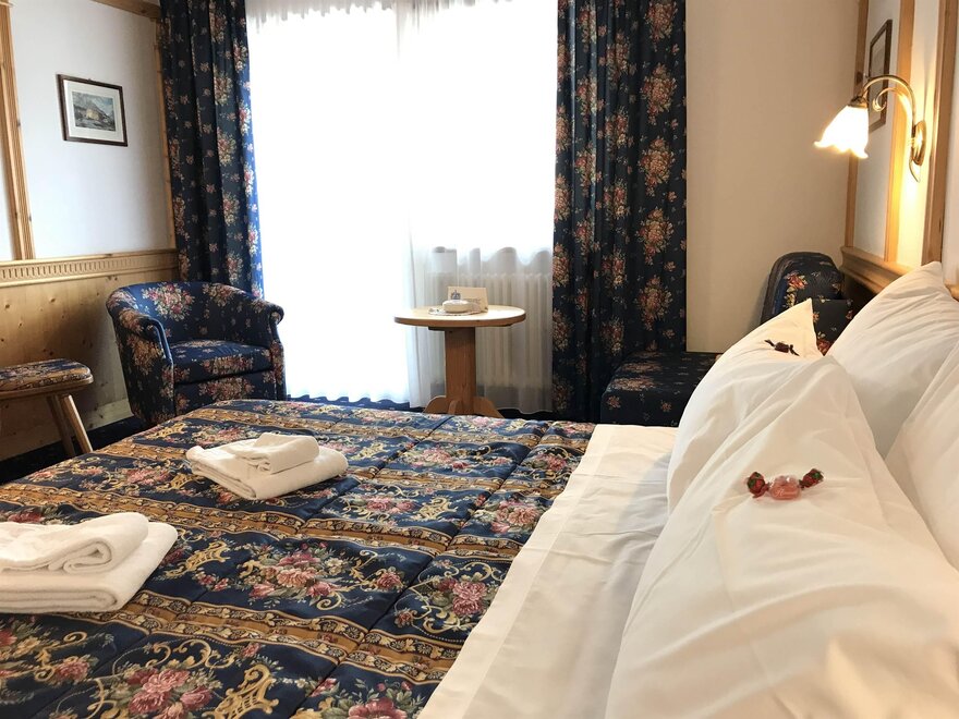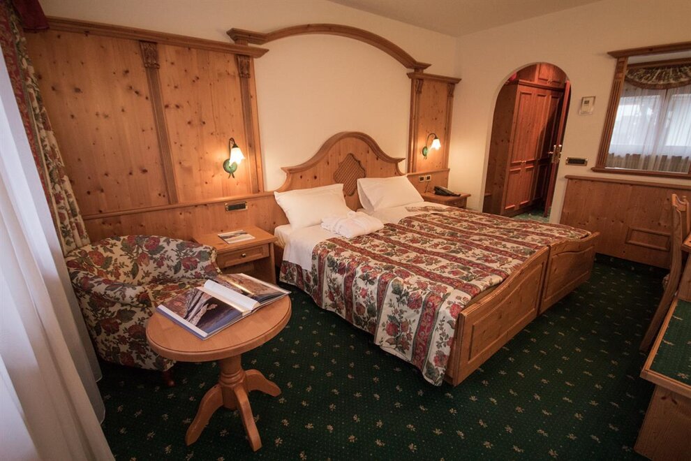 Room furnished in a traditional Tyrolean style. The rooms feature large and comfortable beds, a balcony with a view of Pordoi and the Sassolungo group, satellite TV, WiFi internet, telephone, safe, minibar, bathroom with a hydro-massage shower and hairdryer.