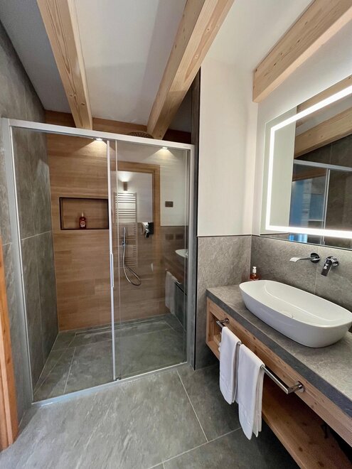 Room furnished in traditional alpine style. The rooms feature large and comfortable beds, a sofa bed, balcony, satellite TV, WiFi internet, telephone, safe, mini bar, bathroom with hydro massage shower and hairdryer. These are non-smoking rooms.