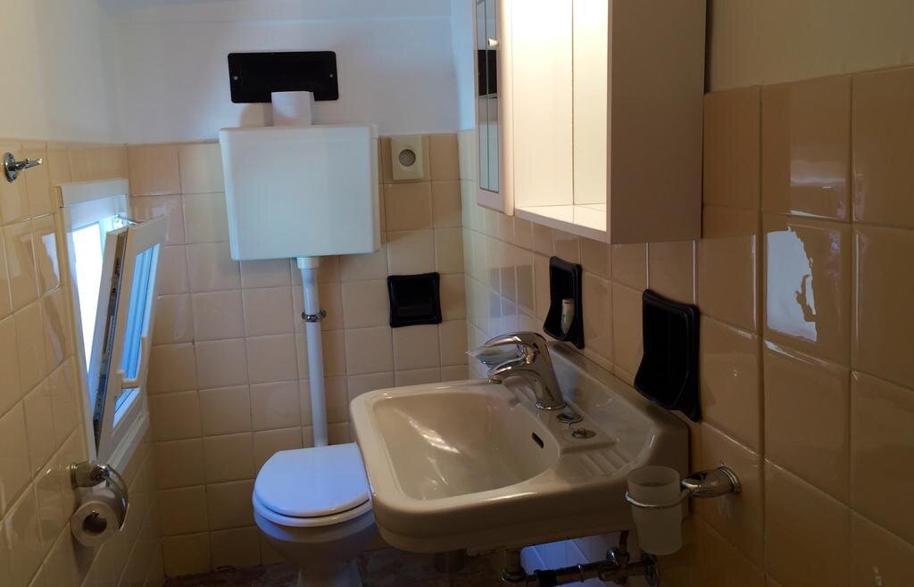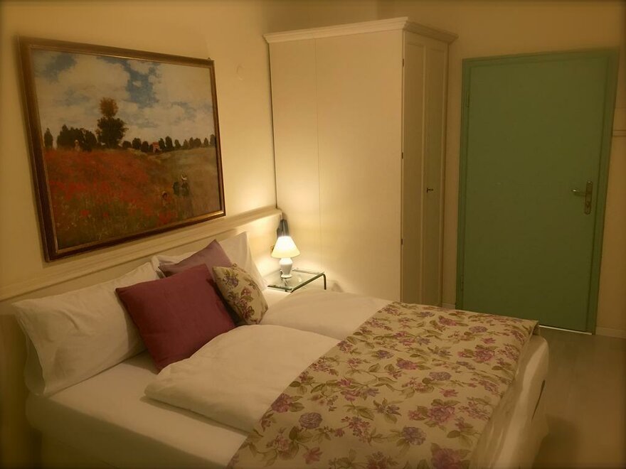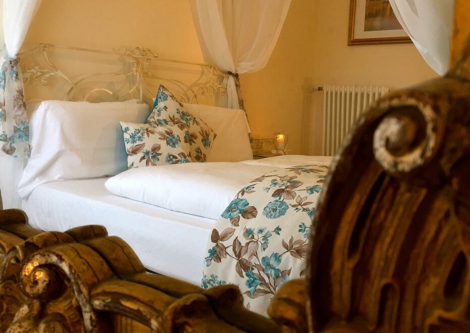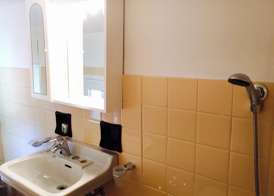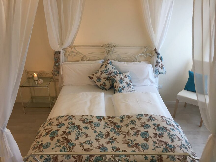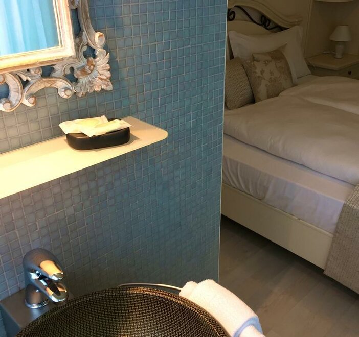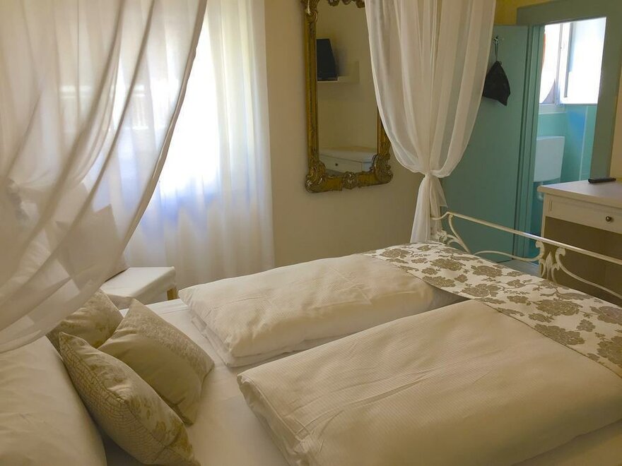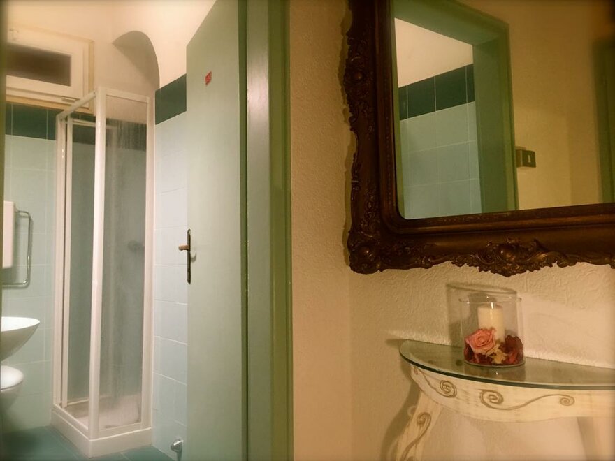 This unique room has a four-poster bed for couples who would love to add a bit of romance to their Riva del Garda getaway or for individuals who simply would enjoy a little extra pampering. Rich floral textures, soft colors and a vintage mirror combine to create an old world mood. This room faces Via Bastione, and is light, airy and cheery. The bathroom is one of our classics--small, with clean teal and blue tiles, shower, sink and toilet.