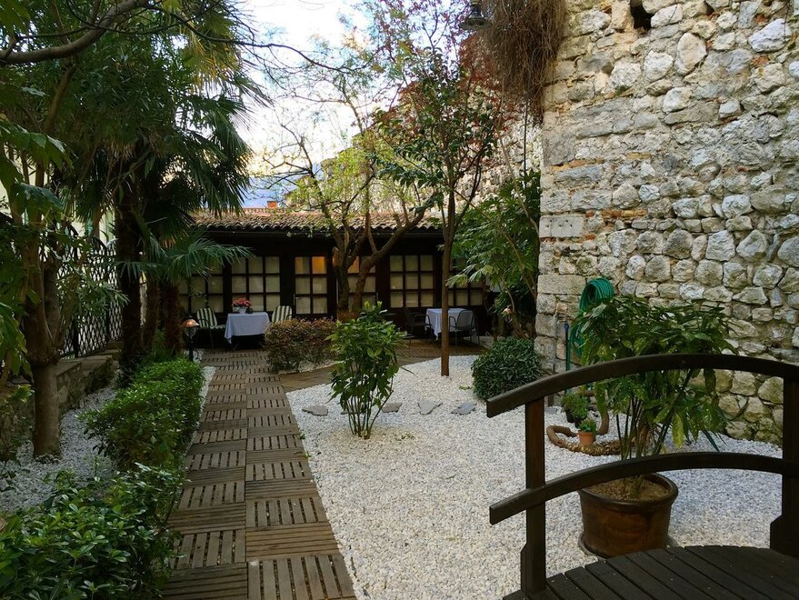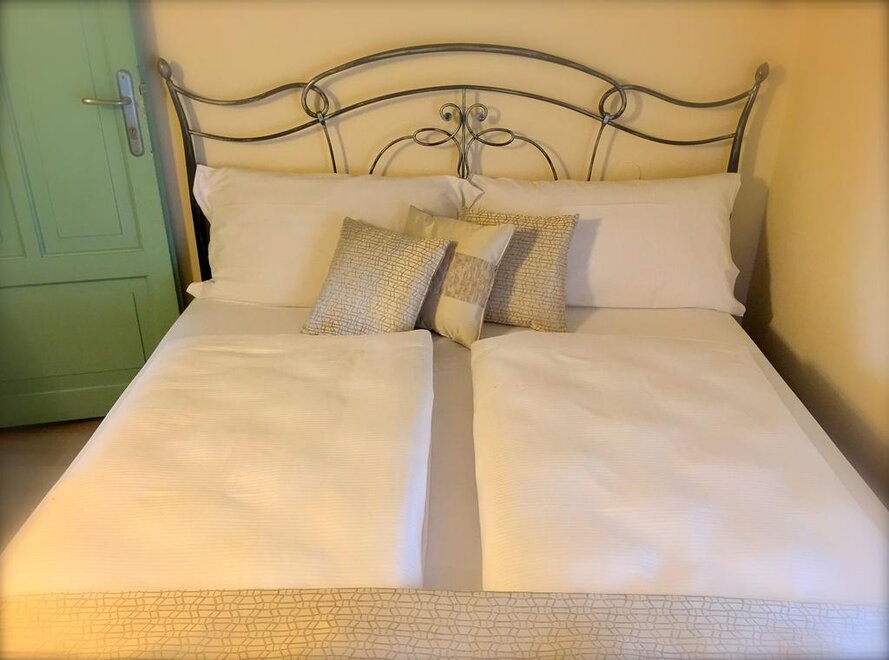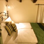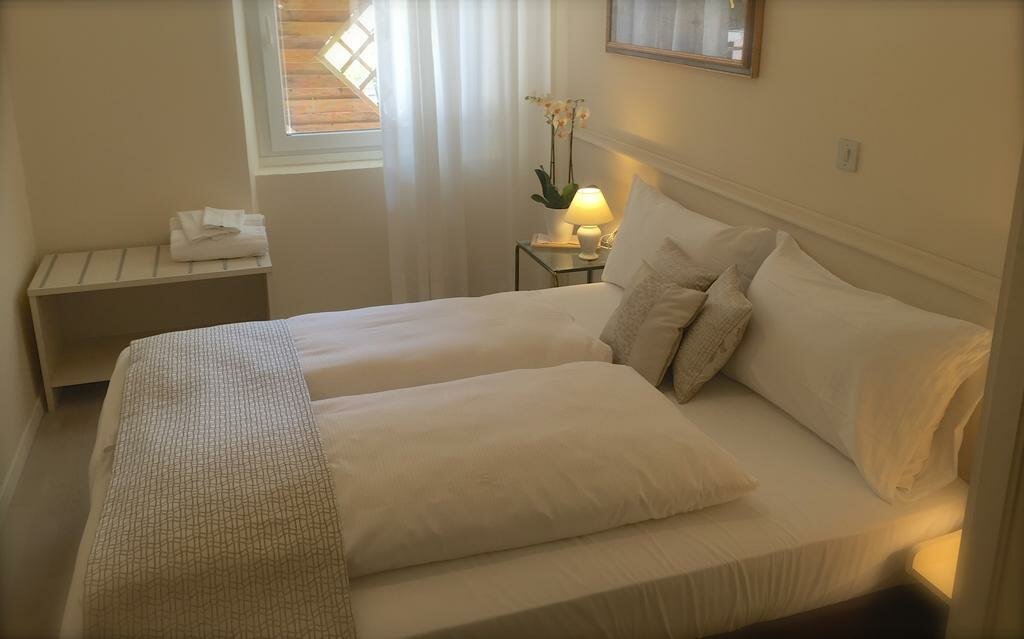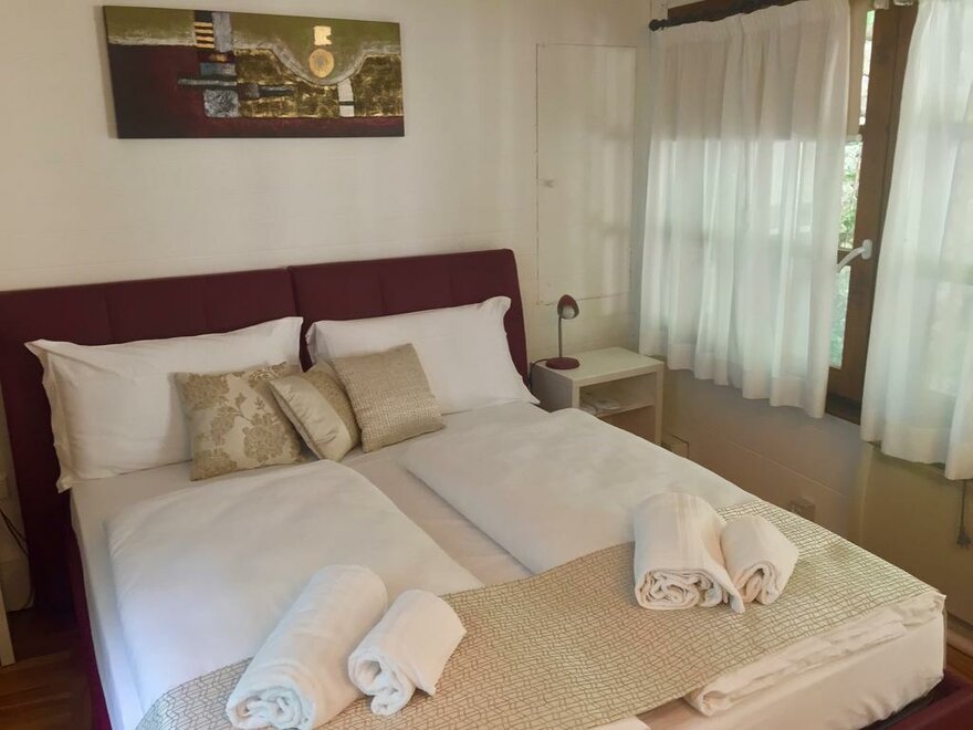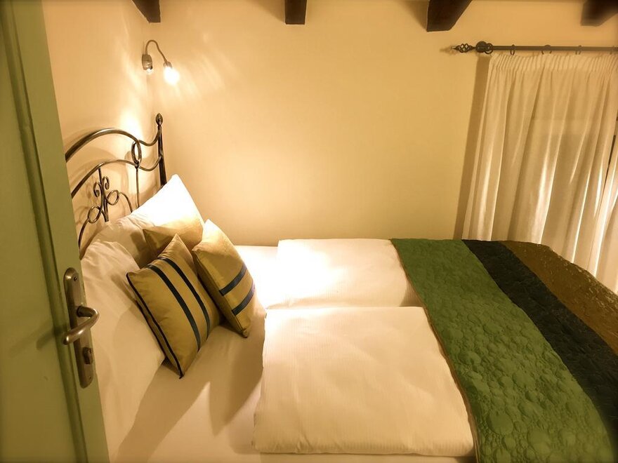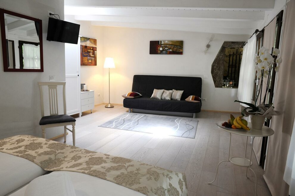 We have two rooms at the end of our private garden adjacent to the Ancient Medieval Walls that marked the perimeter of the charming village of Riva del Garda. The two family suites, being of recent construction, stand out from the style of the main building. Both rooms are equipped with a double bed and a sofa bed, and the bathroom has a shower, toilet, bidet, TV, and air conditioning. Additionally, the patio outside the room allows you to relax in our garden with the option to enjoy breakfast or a drink outdoors.
