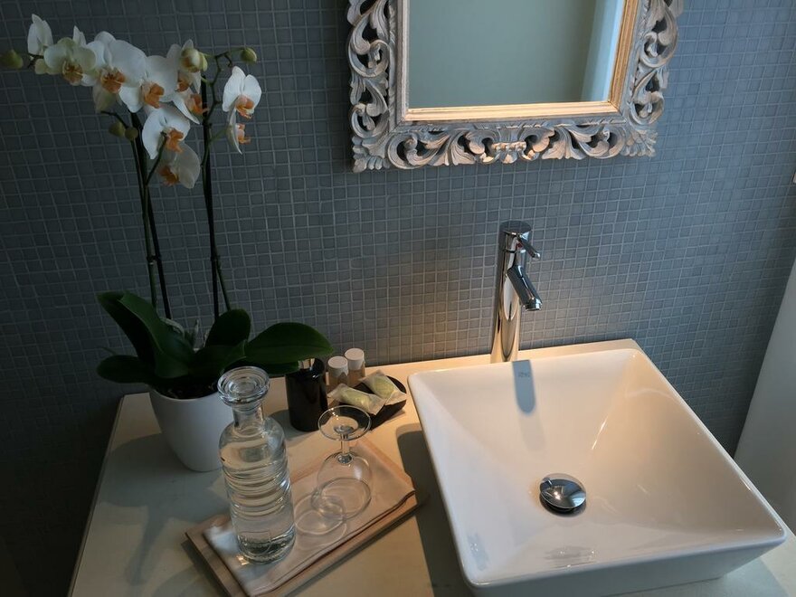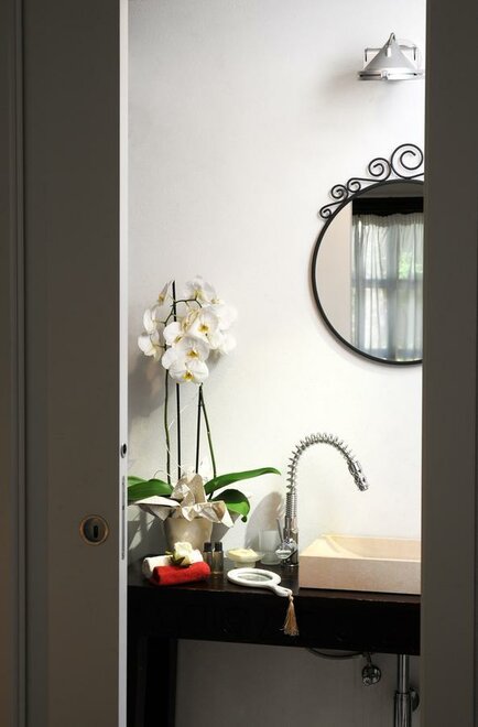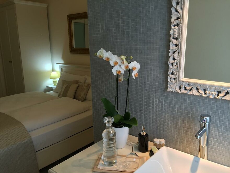 L'Anselim: With window overlooking our terrace, this room is located in our main building and unique in configuration. There is a an entryway with a mirror and sidetable. To the right you find the bedroom and to the left one of the bed and breakfast's more spacious bathrooms, complete with shower, toilet and sink.