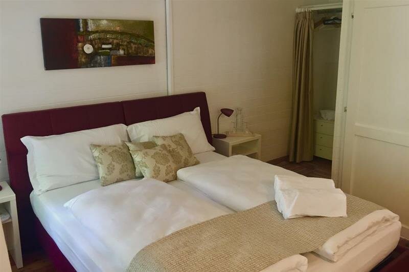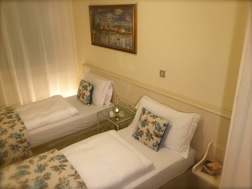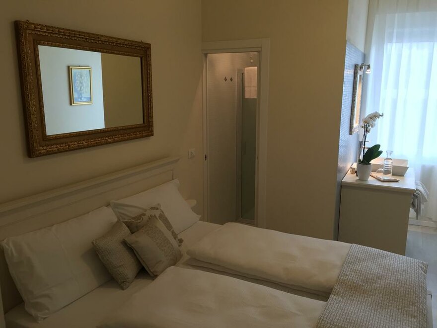 Benaco: Our twin or double room by the same name is located on the upper floor of our main building and overlooks Via Bastione. It features a one-of-a-kind vintage flower-tiled bathroom with sink, shower and toilet, and has a desk and sitting area.