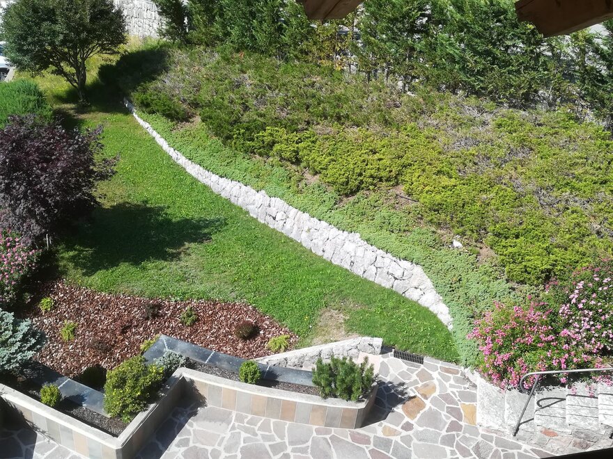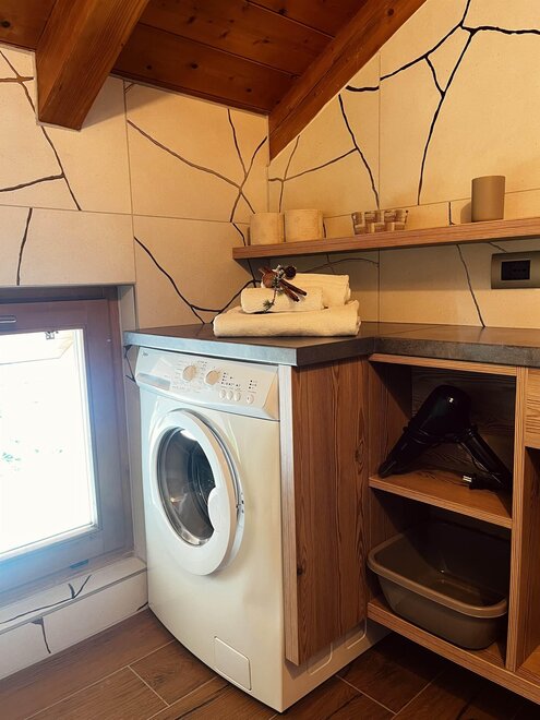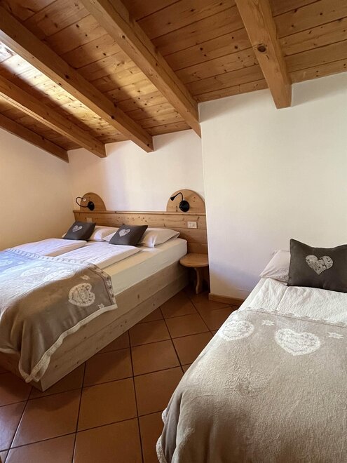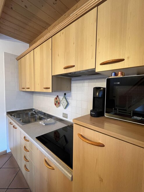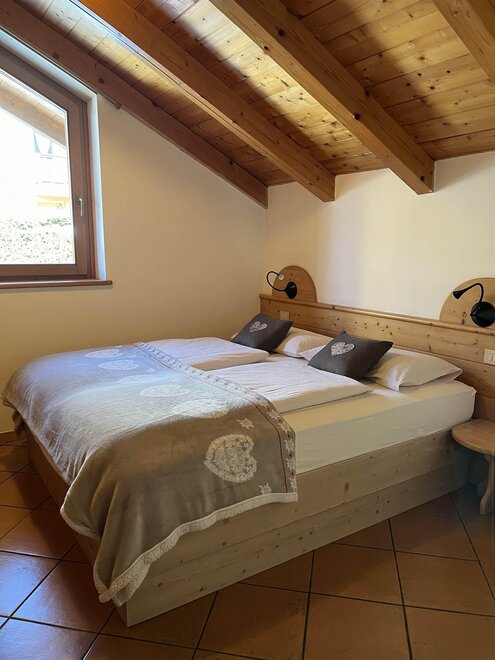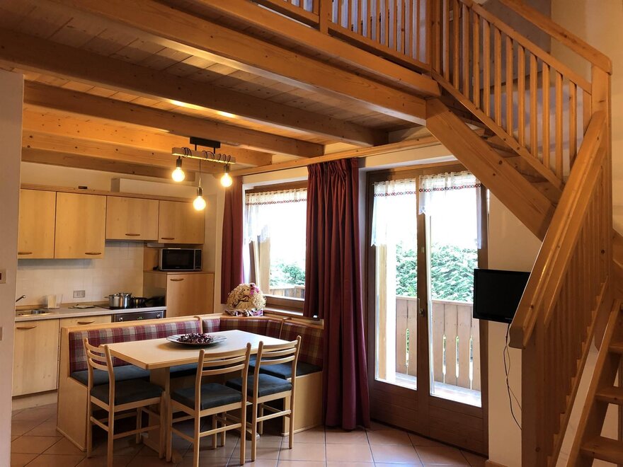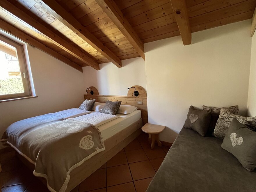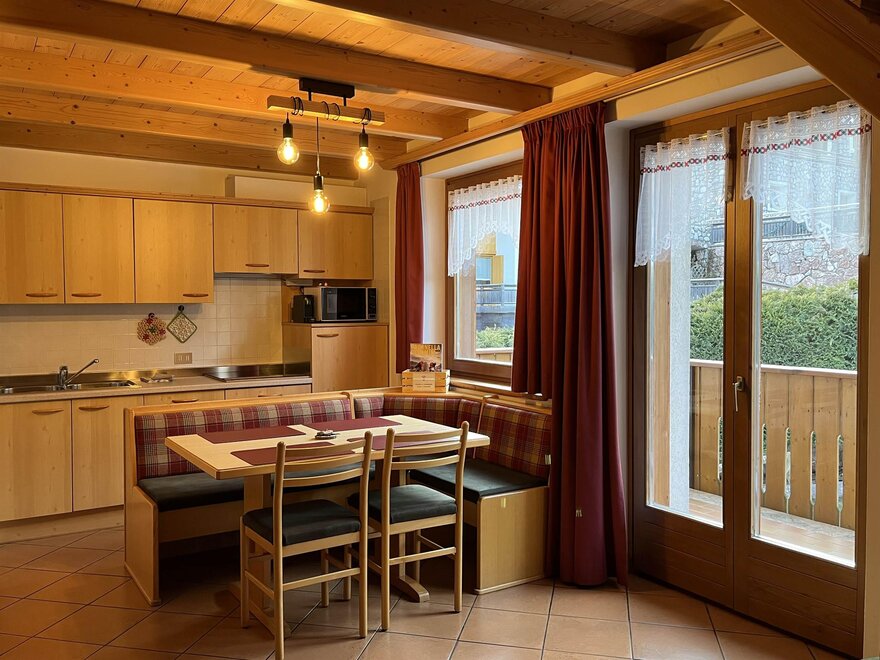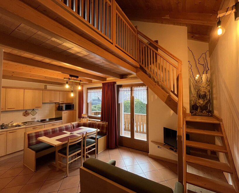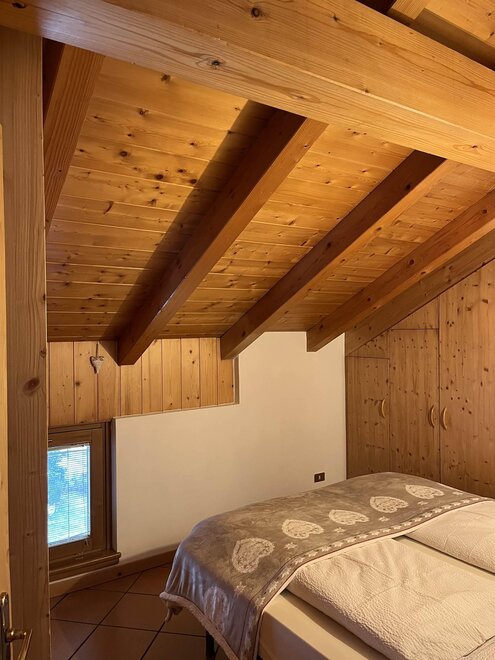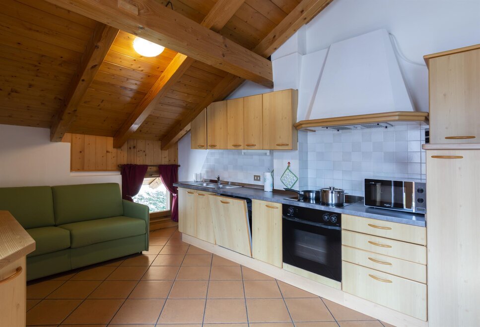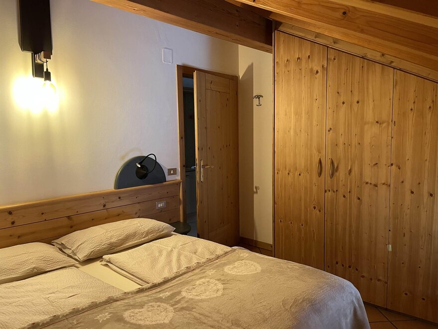 Two-room apartment: (50 m2) for a maximum of 4 people: attic with large east-facing balcony with Paganella view, double bedroom, new bathroom with WC, shower, bidet and washing machine, living room with TV and comfortable double sofa bed, fully equipped kitchen with oven, microwave, induction hob, dishwasher and fridge with freezer compartment.