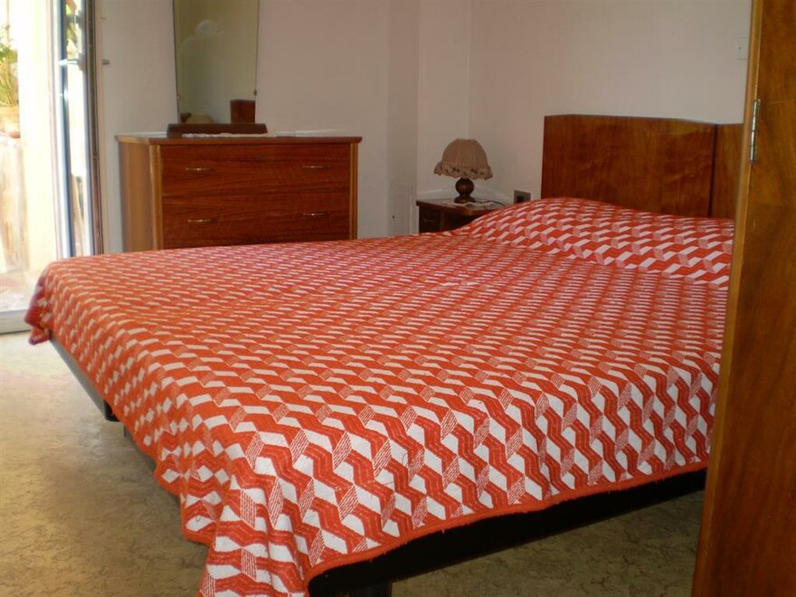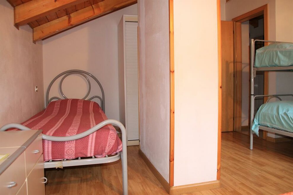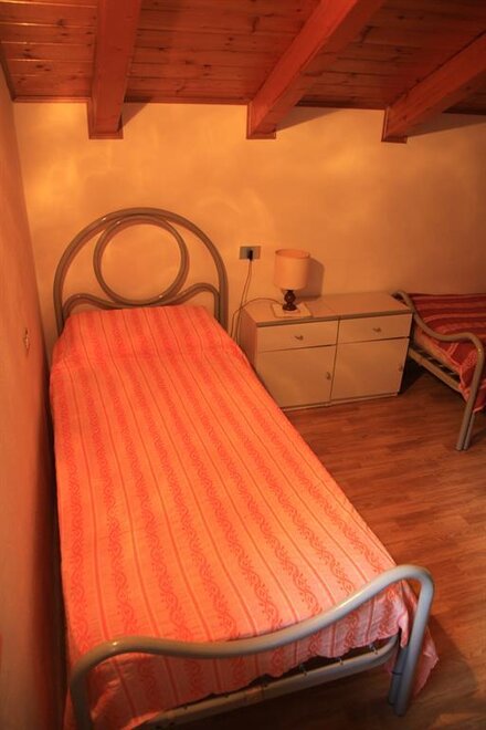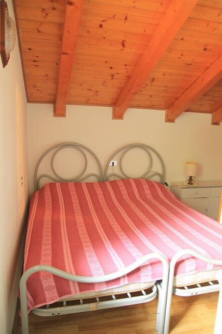 The apartment on the third floor (6+2 pax) is a bright and cozy attic with exposed beams that overlooks the town, the lake and the mountains above. The apartment, with heating and simply furnished, is ideal for families or groups of friends to his room that can comfortably accommodate 6 people and if you are a larger group you can add two beds in double rooms. The bedrooms are divided into one room with double bed (can add a camp bed for children) and another with a bunk bed and two single beds (can merge them into double bed). The living area (open space) consists of a kitchen with gas hob and electric oven, and a small living room with TV and balcony facing the lake. Finally the bathroom has a tub / shower and in the closet there is a washing machine.