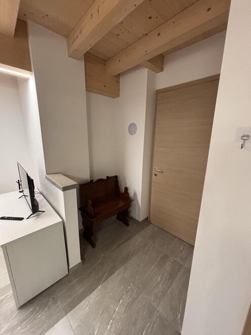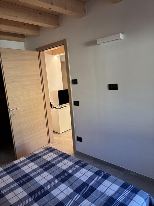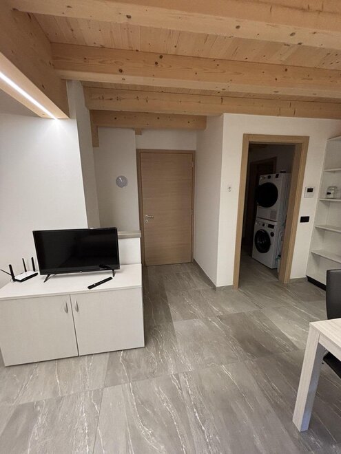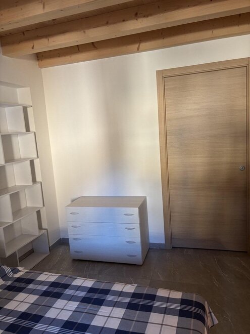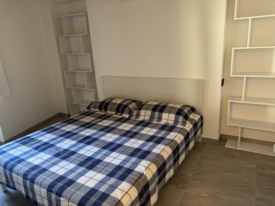 Newly renovated apartment located on the first floor of a small building, consisting of a bedroom with a walk-in closet, living room with kitchenette, ante-bathroom with washing machine and dryer, and a large bathroom with shower.