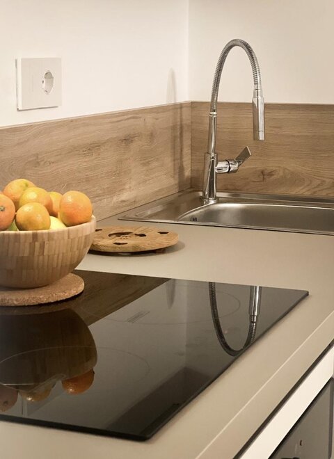 Two bedrooms, + sofa bed in the living room. Fully equipped kitchen with induction cooktop, oven, microwave, fridge + freezer, and dishwasher. The bathroom has a large shower with ceiling rain shower + hand shower, hairdryer, and towel warmer. Furnished balcony with sitting area and table.