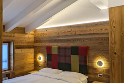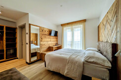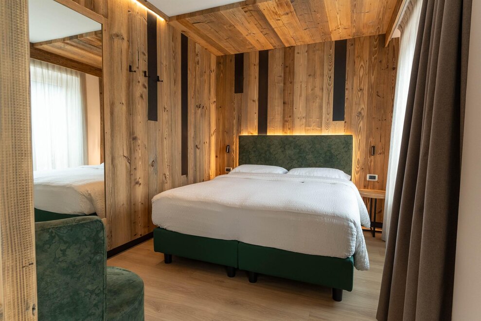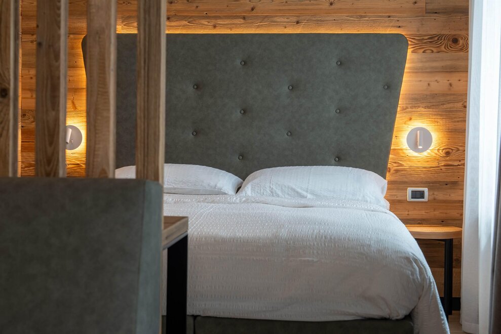 Bright and welcoming, the Panorama Superior combines the charm of alpine style with modern and refined details. The natural wooden floor and furnishings made from reclaimed wood from ancient huts create an authentic and evocative atmosphere. The balcony overlooks Piazza Brenta Alta and Mount Spinale, offering spectacular views at any time of the day. Perfect for those who wish for a charming stay in the heart of Madonna di Campiglio.