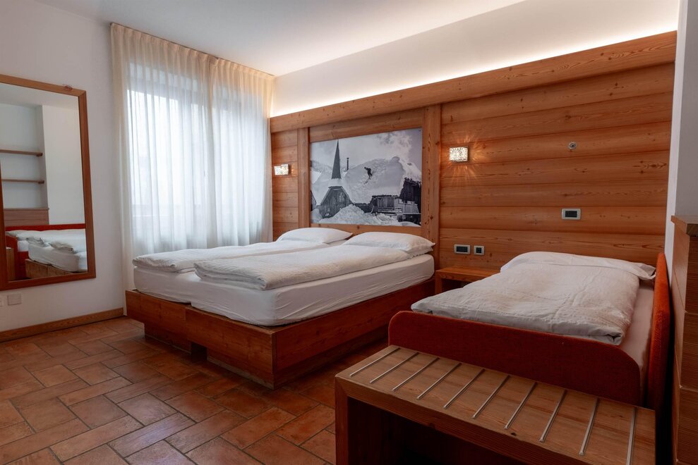 Designed to ensure comfort and privacy, the Family Room consists of two separate rooms: one double and one triple, ideal for families or small groups. The modern furniture in larch wood and the wooden floor create a warm and welcoming environment. Both rooms are equipped with a wardrobe, desk, and TV, and share a spacious bathroom with a shower.