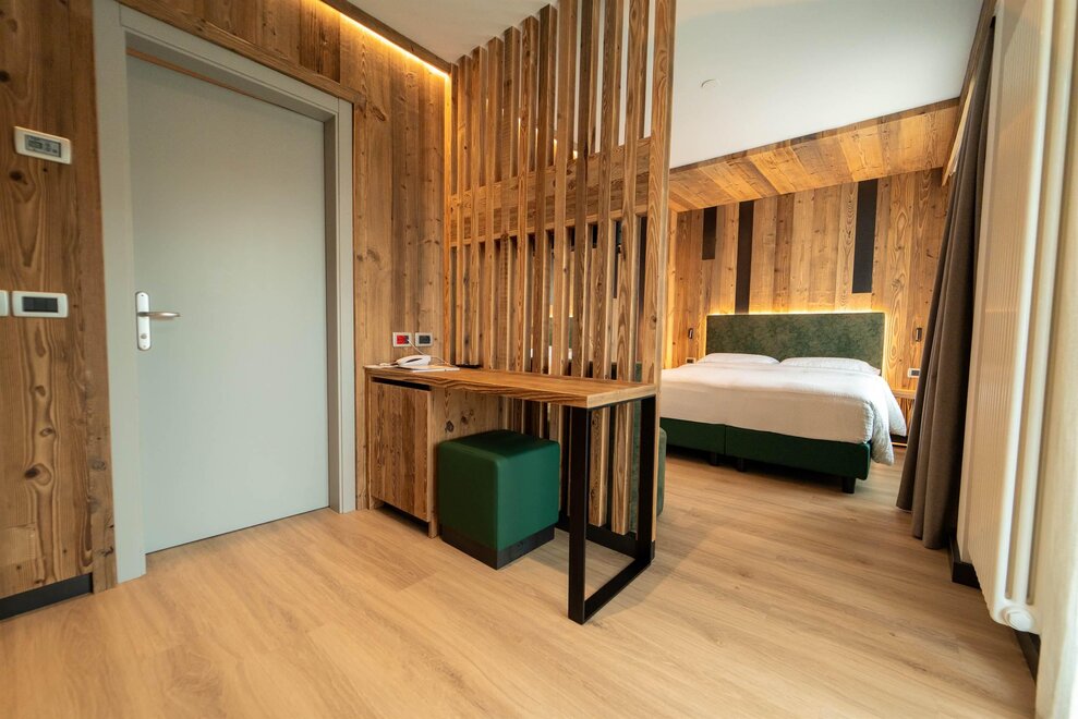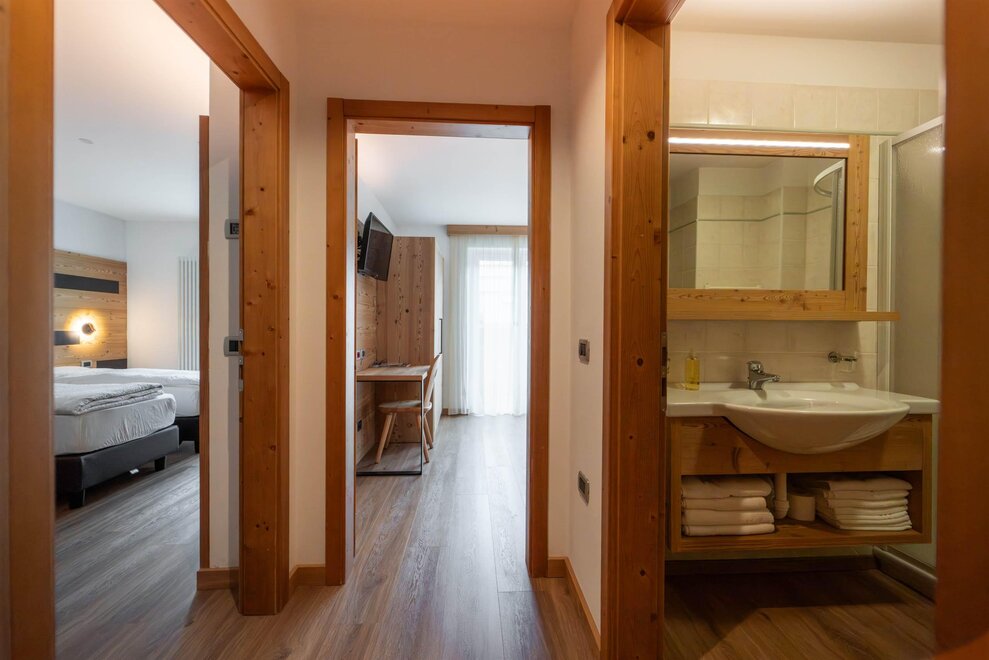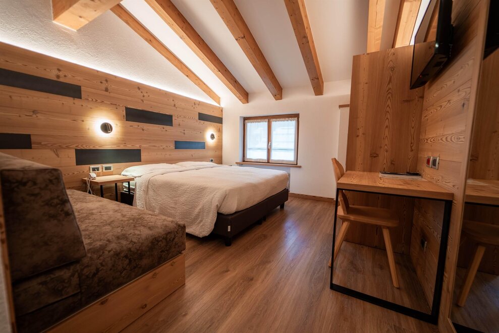 The Junior Room is an ideal solution for families or small groups. Consisting of a double bedroom and a second communicating room with two single beds, it offers ample space and comfort. Both rooms are furnished in Alpine style and equipped with a wardrobe, desk, and TV. They share a spacious bathroom. Upon request, it is possible to add a fifth bed or a crib in the double bedroom.