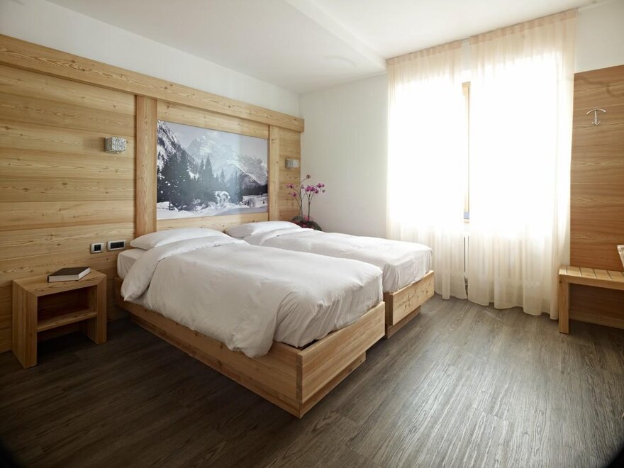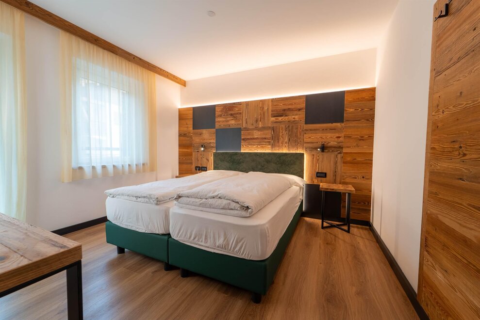 Essential elegance and comfort meet in the Dolomiti Room, finished with larch wood and Alpine-style details. The wooden floor contributes to creating a warm and refined atmosphere. The balcony offers a pleasant view of the mountains, perfect for starting the day or relaxing at sunset. It also features a spacious wardrobe designed for long stays, a bathroom with a shower, TV, safe, and free Wi-Fi. Single beds are available upon request.