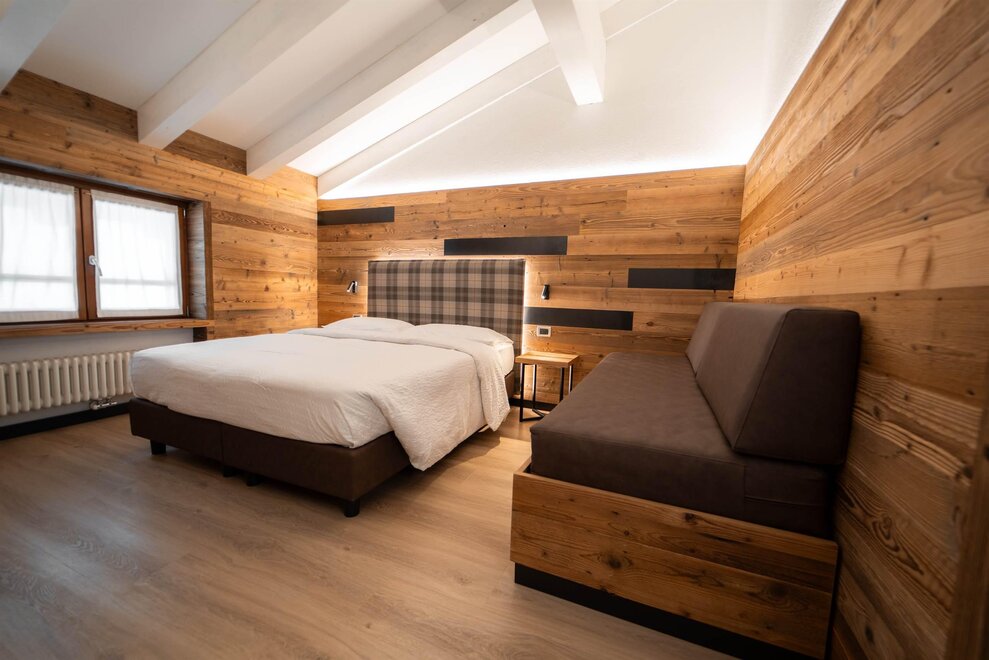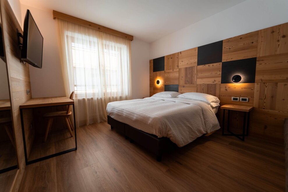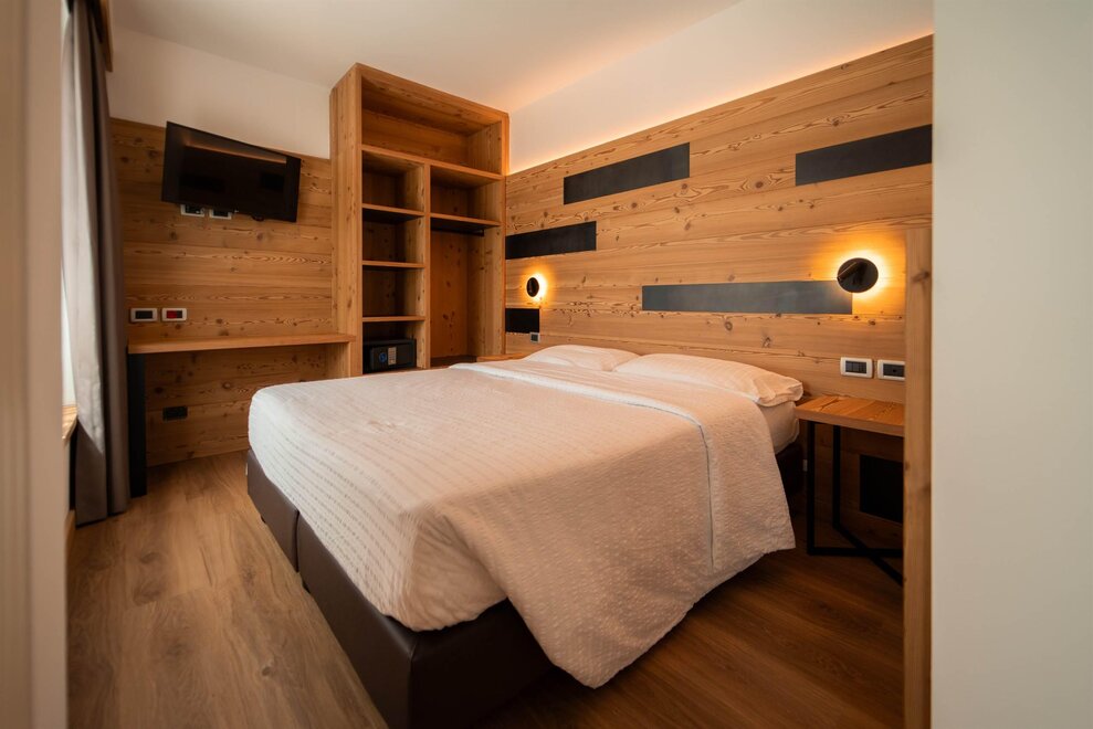 Simple and welcoming, the Classic room is furnished in alpine-style wood, with well-organized spaces and a warm mountain atmosphere. Ideal for couples or single travelers, it offers a bathroom with shower, TV, safe, and free Wi-Fi. Upon request, it can be prepared with single beds.