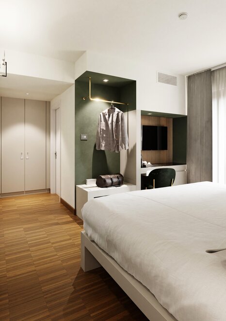 SMART GARDEN 16-18 m² Zimmer mit zwei Betten, im ersten Stock oder Erdgeschoss der neuen “Residenz Garden” neben dem Hotelpark gelegen. In all the spacious luminous rooms of the hotel the elegance of the choice of colours and materials is accompanied by exclusive comfort : comfortable beds, air conditioning, satellite-TV, sound-proofing, safe, telephone, and ADSL line for internet access. The different room types - SmartGarden, Smart, Superior, Junior Suite and Suite – satisfy even the most diverse requirements.