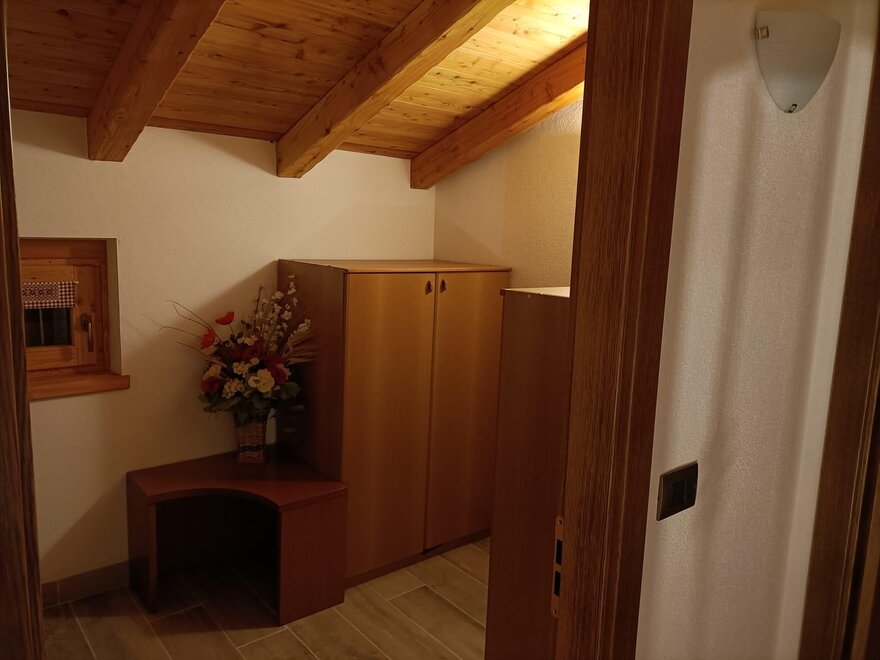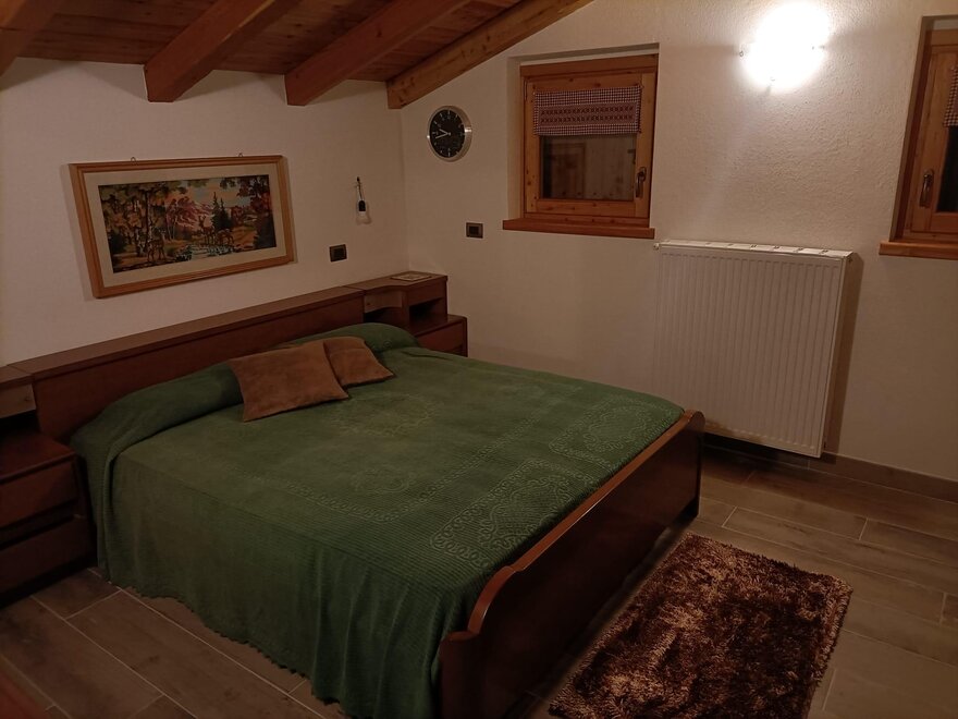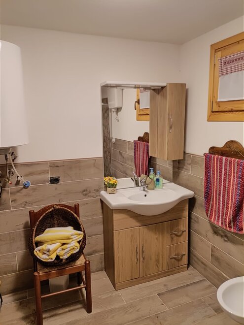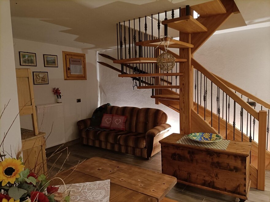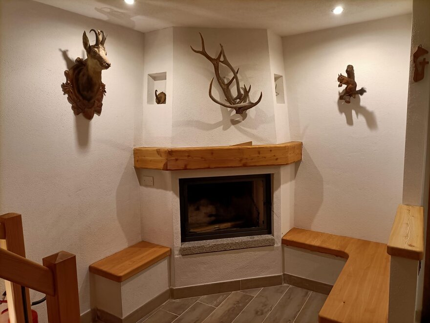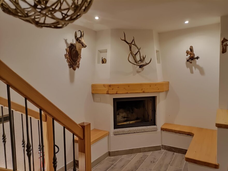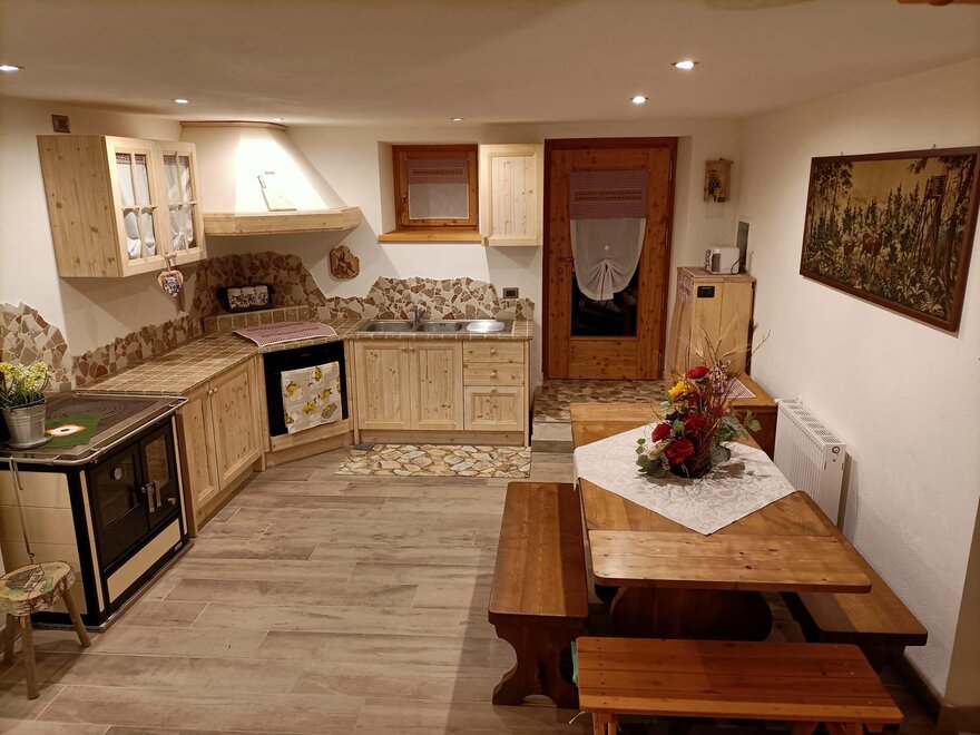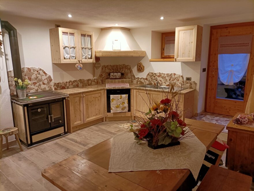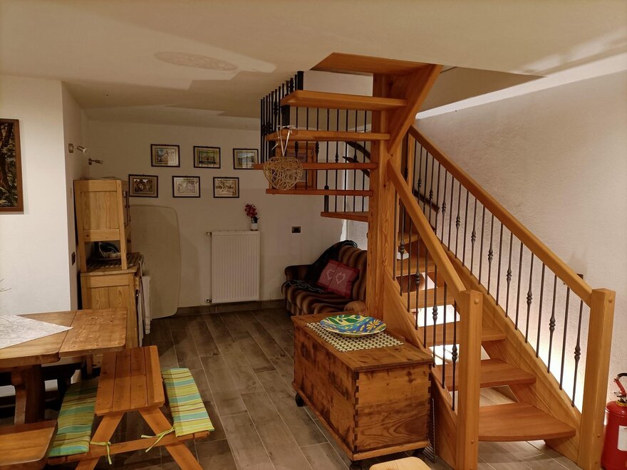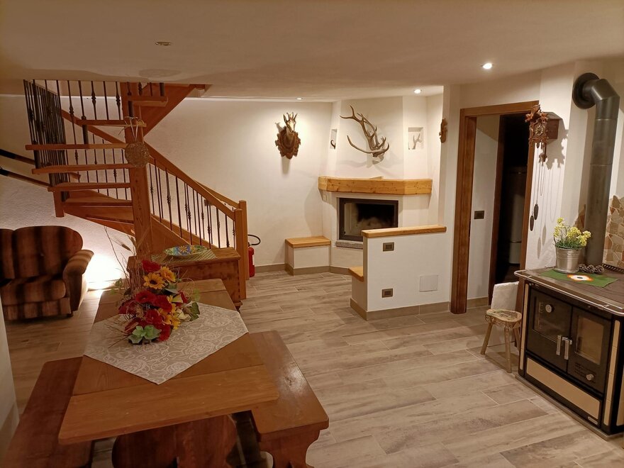 The cabin is arranged on two levels: on the ground floor there is the living area with a fully equipped kitchen and a beautiful wooden table with a stove for preparing typical dishes; a fireplace corner where you can relax in front of a nice viewable fire and a service area.