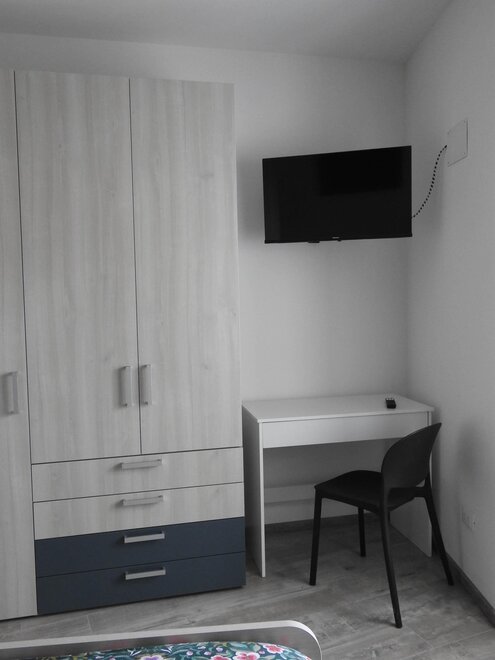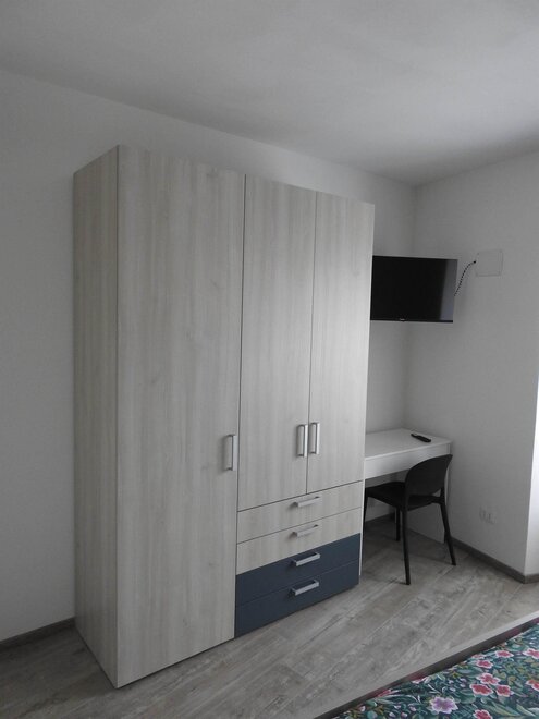 Bright, cozy, and functional, it features a comfortable double bed, a spacious wardrobe, a desk, and a TV.
