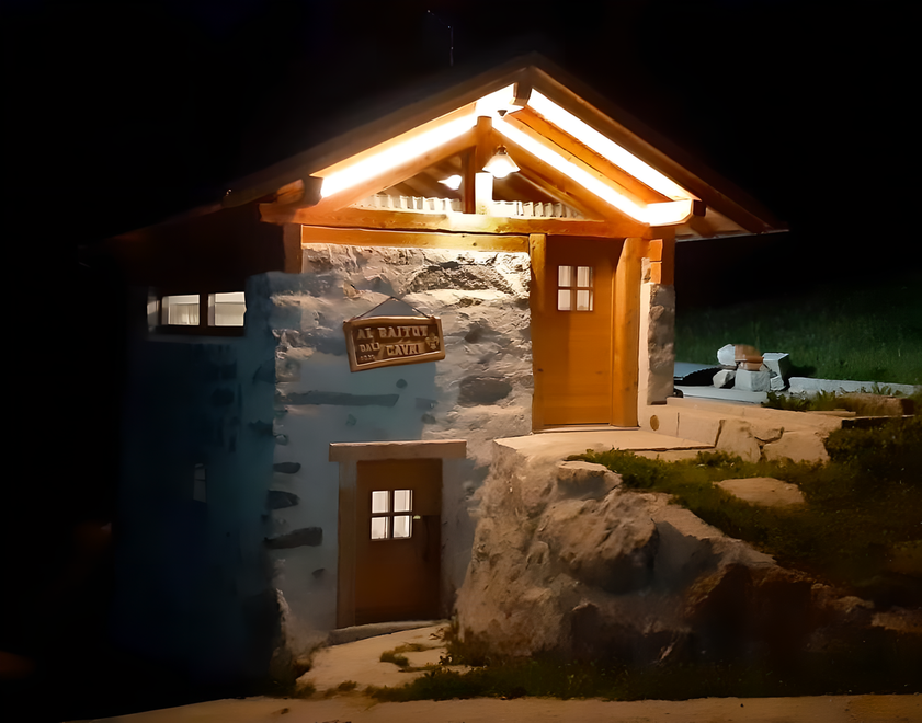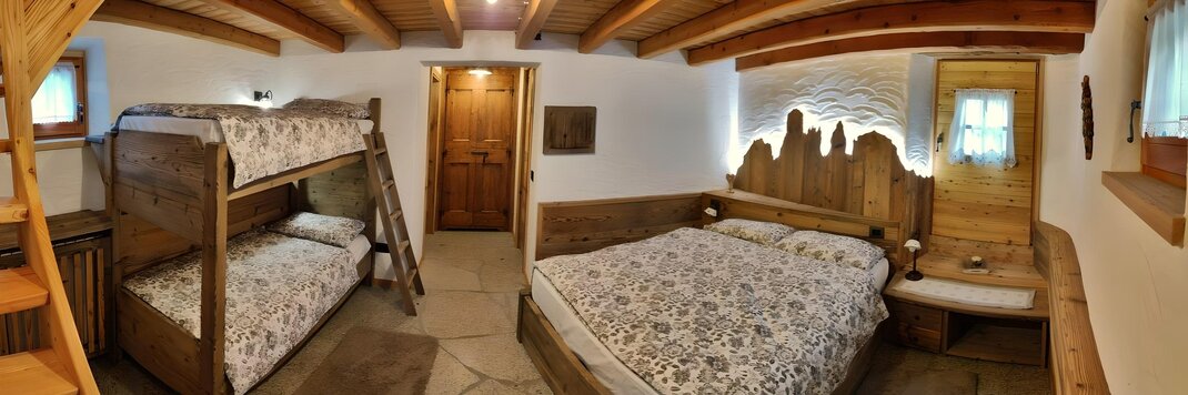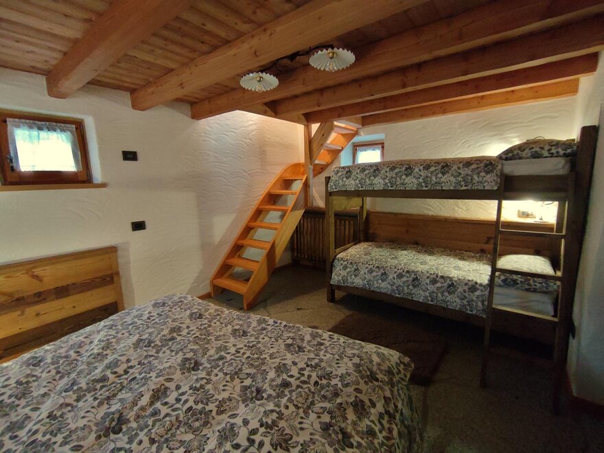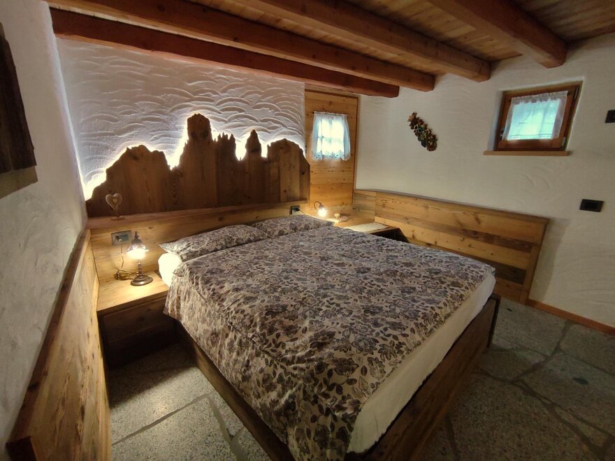 Descending to the first floor via a rustic wooden staircase, one accesses the sleeping area finely furnished, enhancing the antique solid wood for the furniture and panelling and the granite (tonalite from the Val di Genova) for the flooring. At guests' disposal the chalet is equipped with a double bed and a typical bunk bed made of solid wood. The sleeping area has access to a large bathroom and a storage room. For heating in the cold seasons you can rely on both gas heating system and a wood-burning stove. At guests' disposal there is also an outdoor area (not yet definitively finished) where you can relax and read or sunbath suroounded by nature and tranquillity.