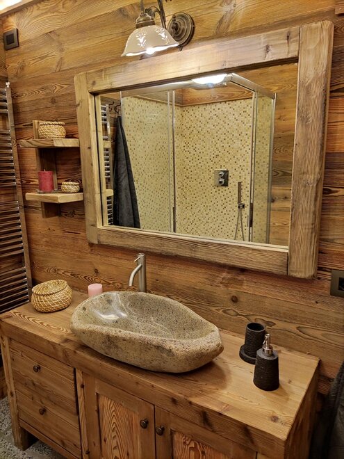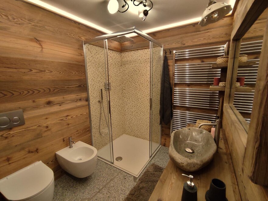 Descending to the first floor via a rustic wooden staircase, one accesses the sleeping area finely furnished, enhancing the antique solid wood for the furniture and panelling and the granite (tonalite from the Val di Genova) for the flooring. At guests' disposal the chalet is equipped with a double bed and a typical bunk bed made of solid wood. The sleeping area has access to a large bathroom and a storage room. For heating in the cold seasons you can rely on both gas heating system and a wood-burning stove. At guests' disposal there is also an outdoor area (not yet definitively finished) where you can relax and read or sunbath suroounded by nature and tranquillity.Bathroom facilities