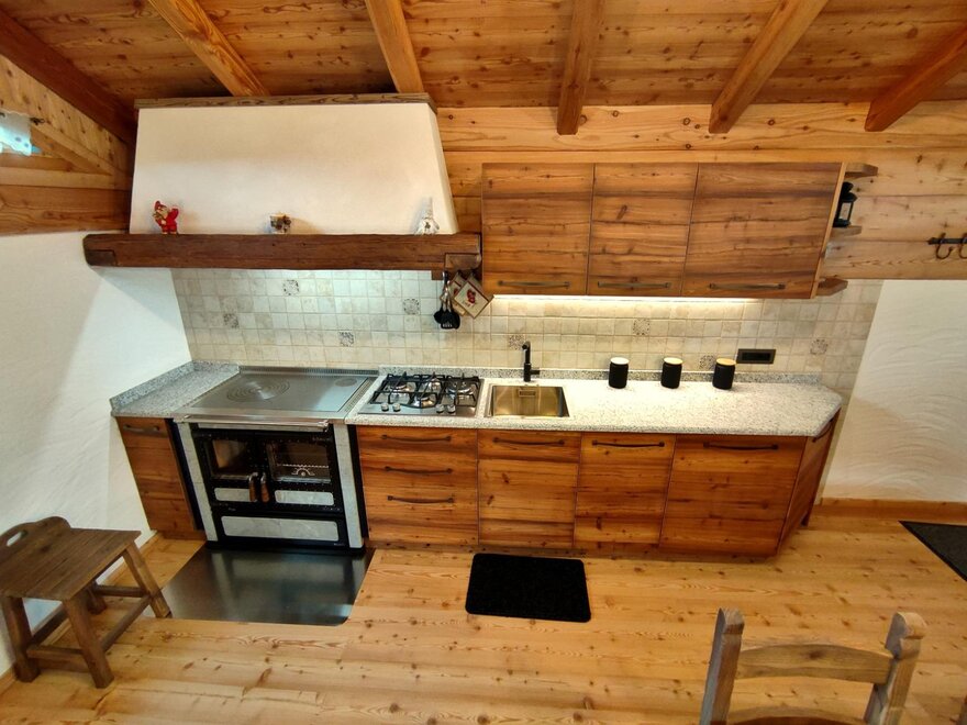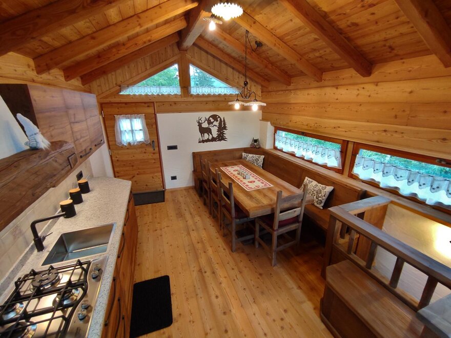 The chalet of about 50 square metres in total is on two floors and can accomodate up to 4 people. The main entrance leads to the living area (dominated by wood as the main furnishing and construction material) where there is a large table and the kitchen equipped with a gas cooker, fridge, dishwasher and the typical wood-burning stove.