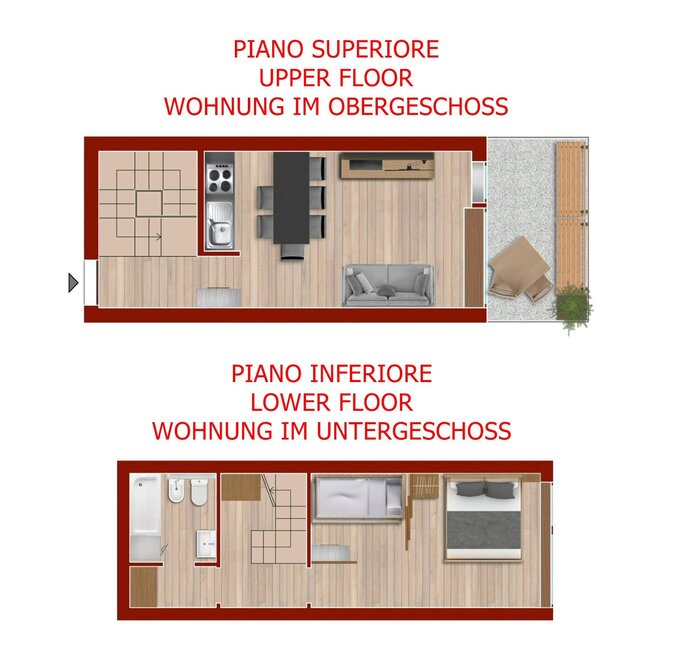 On the ground floor you’ll find a fully equipped kitchen (dishwasher, microwave, coffee machine), a living space with sofa bed, TV and dining table; the sleeping area includes a double bed plus bunk bed and a privacy partition.