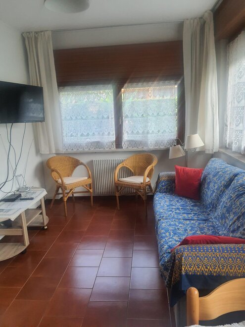 OFFICIAL APARTMENT NOSurrounded by a beautiful garden and an outdoor veranda with table and chairs, the 3room apartement consist of living room with Sat-tv, with kitchenette, equipped with oven, microwave, fridge. It offers two bedrooms, bathroom with washing - machine, hair dryer. Iron and ironing board at disposal. Bed linen and bath tovels are included.