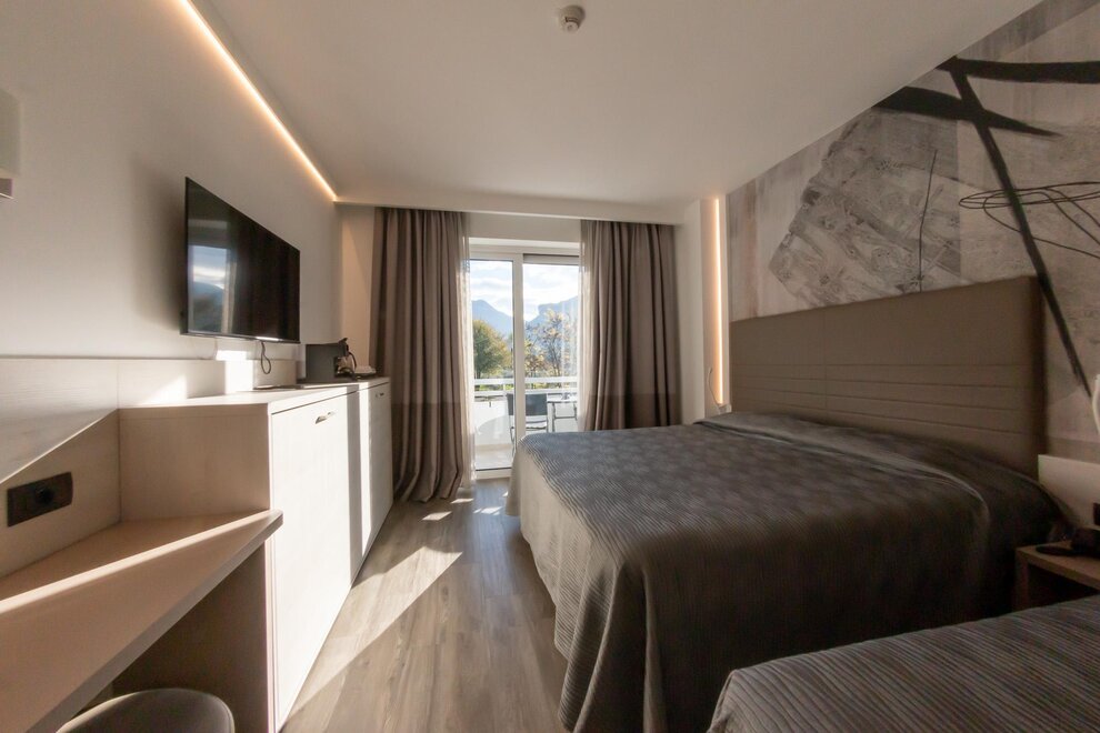 Our superior quadruple room with balcony and side view is the perfect choice for families or groups seeking a spacious and comfortable stay. The balcony, with a side view, offers a unique glimpse of the surrounding tranquillity, ideal for relaxing outdoors or enjoying a moment of peace.