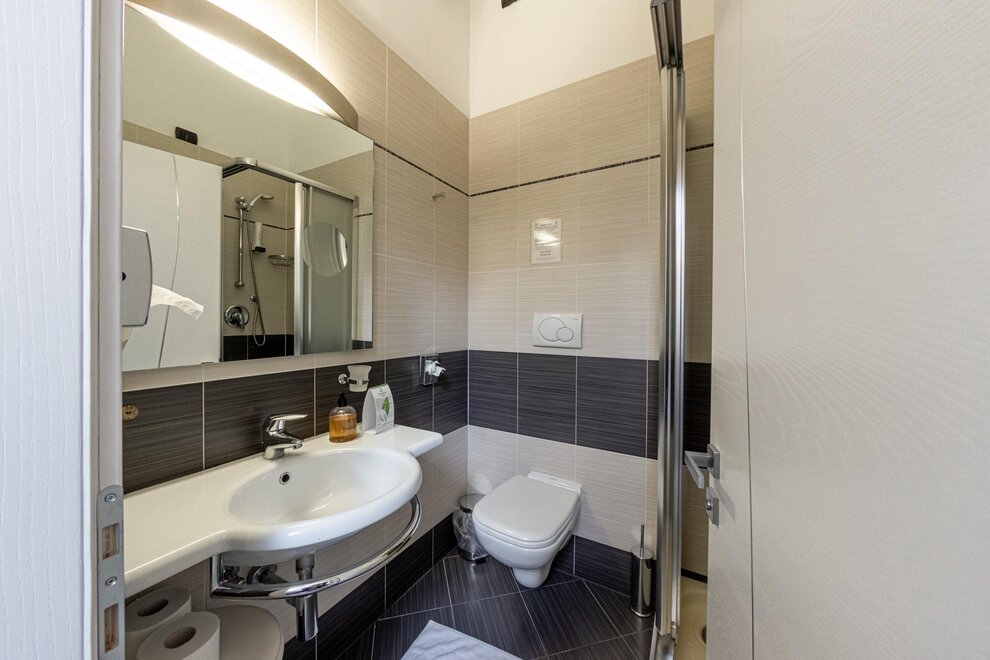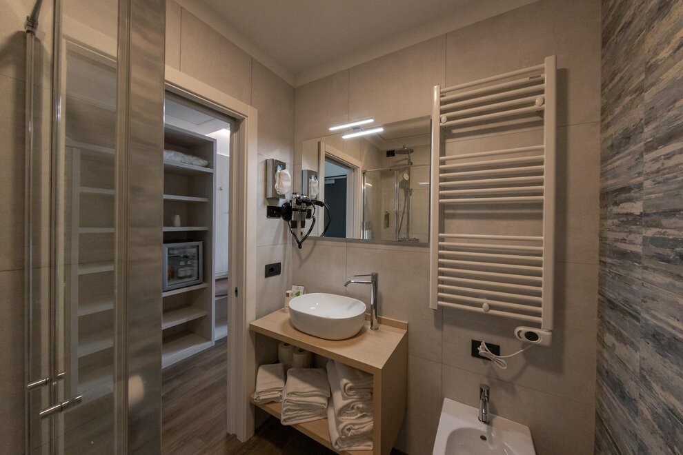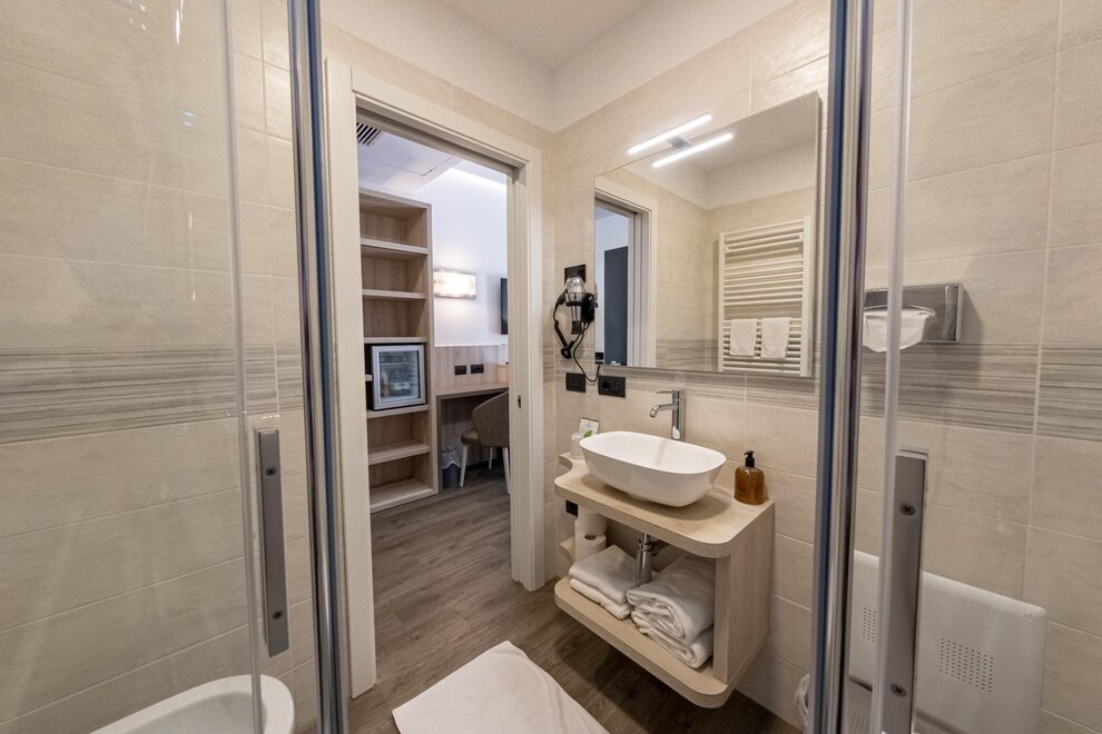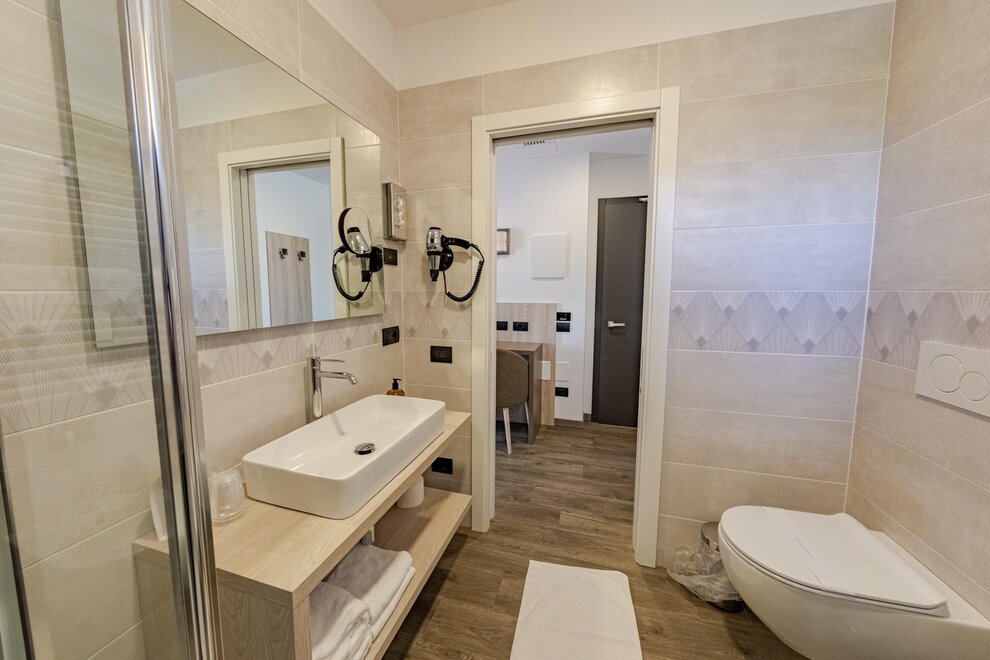 The private bathroom, equipped with a complimentary courtesy set, allows you to choose between bath or shower for tailored comfort. Ideal for sharing precious moments, this room enables a travel experience without compromises.