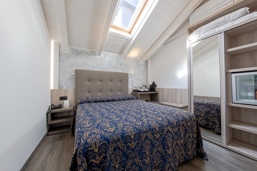 Our welcoming attic single room with skylight is the perfect retreat for those seeking a break marked by comfort and functionality. Air-conditioned and equipped with free Wi-Fi, it offers a satellite LCD TV to entertain you and a minibar always available for a snack.