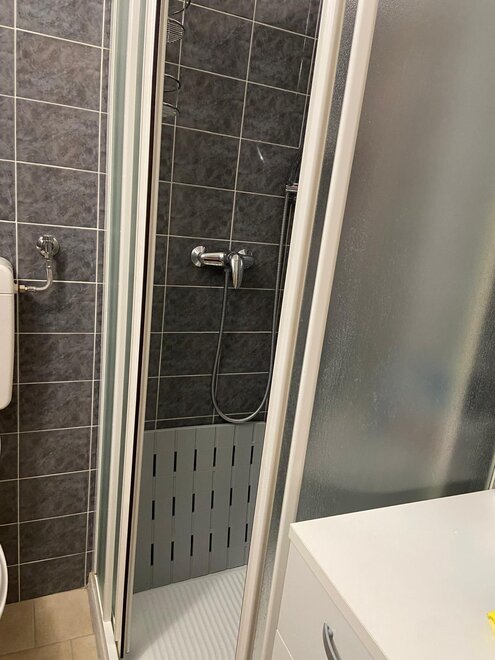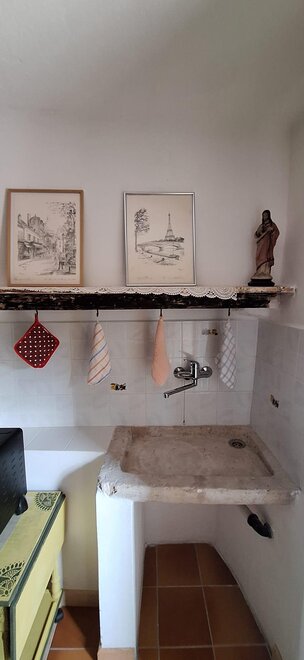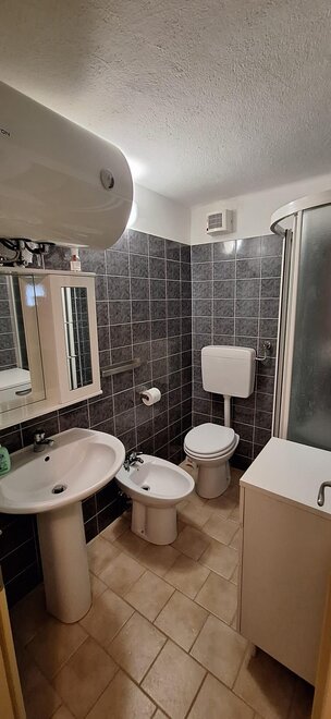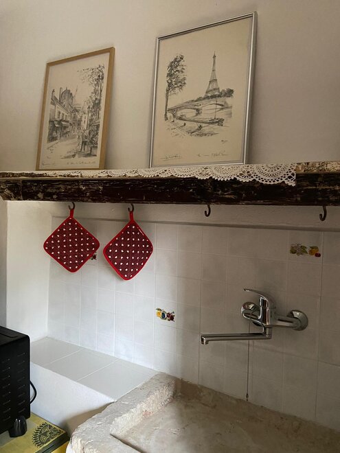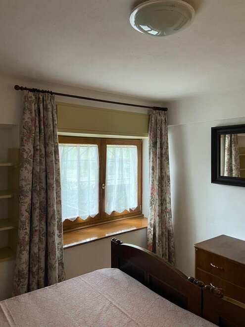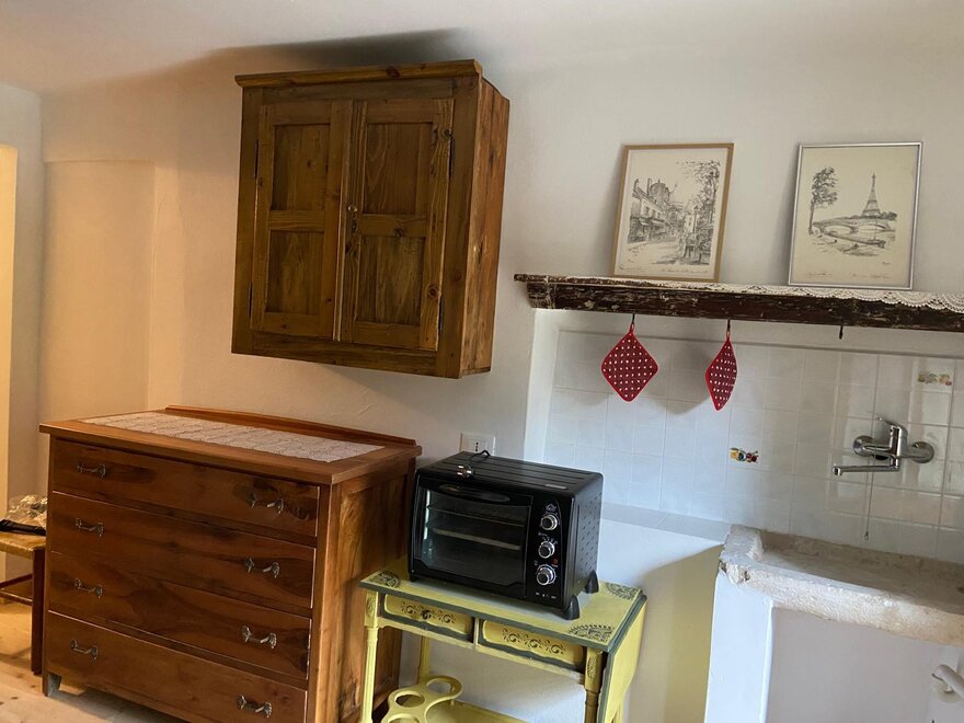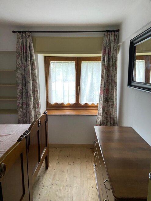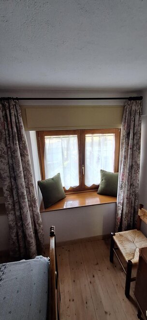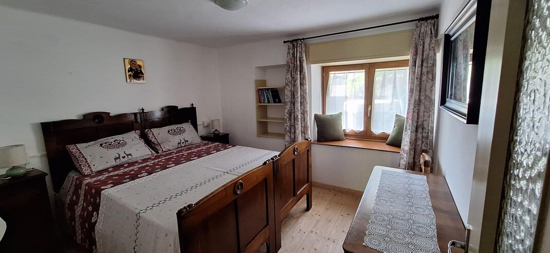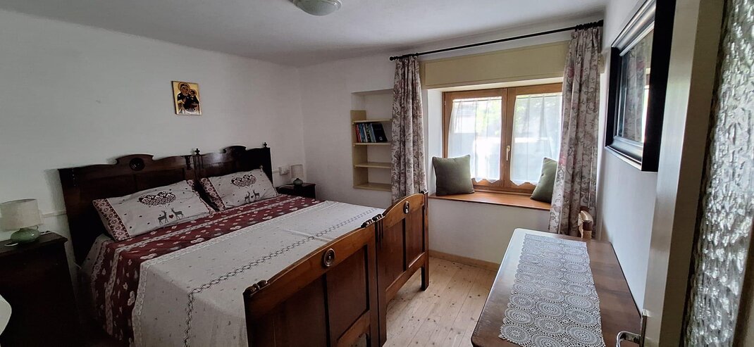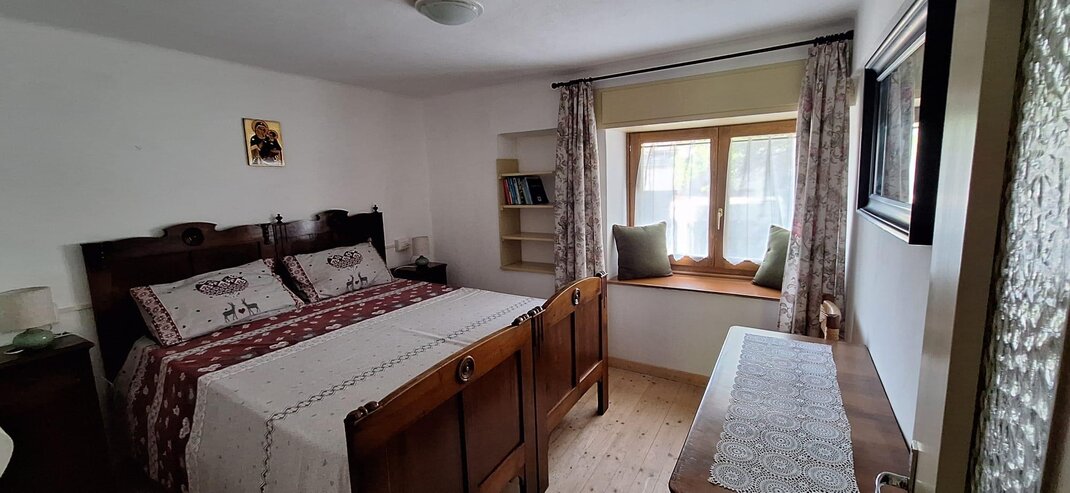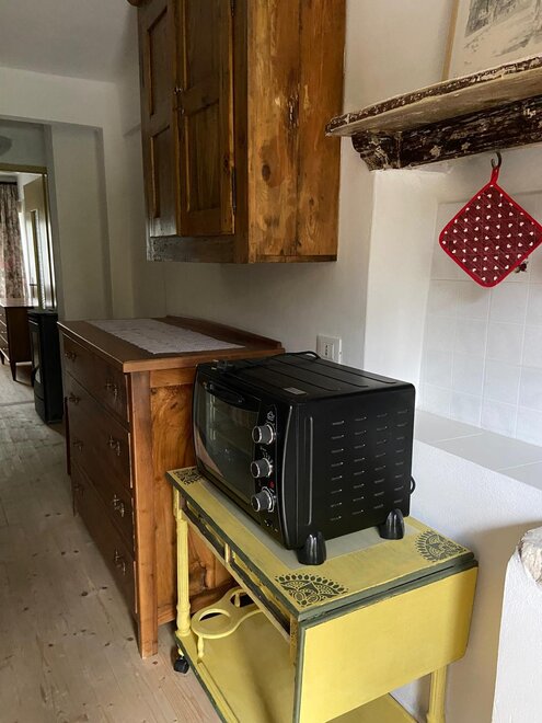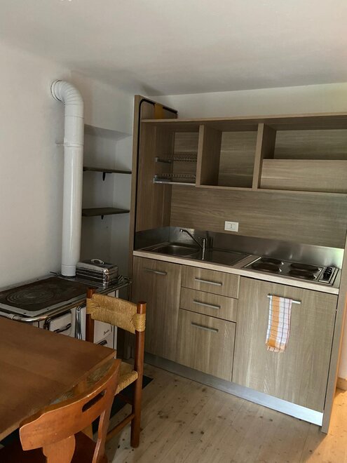 The apartment is rustic and well-maintained, newly renovated. The wooden floors and furnishings make it very warm and welcoming. The view of the mountains is enchanting! The space is divided into a living area with kitchen, a bathroom with shower box, and a double bedroom.