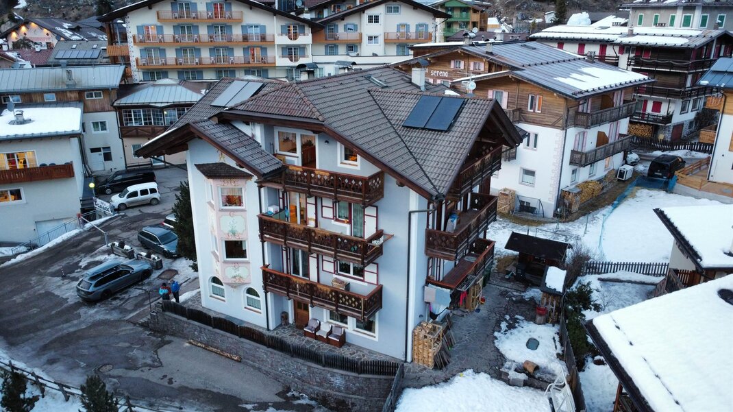 Coming from the Sella/Pordoi/Fedaia passes and taking via Pareda at a certain point you will find the Detomas Shop. At the end of the house where the shop is located, on your right you will find the small road that takes you to Cesa Castlunger