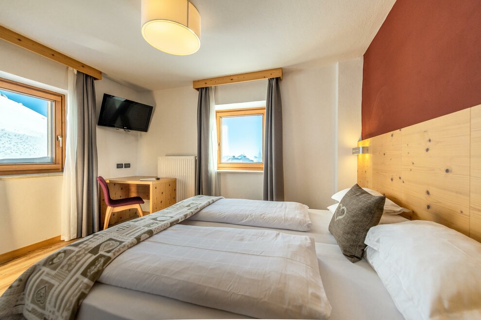 Room furnished in fragrant pine wood with view of the Sass Pordoi Mountain and equipped with private en suite bathroom with bidet, shower and complimentary toiletries, tea and coffee making station, desk, safe, free Wi-Fi and flat-screen TV with satellite channels. Please specify bed preference when booking.