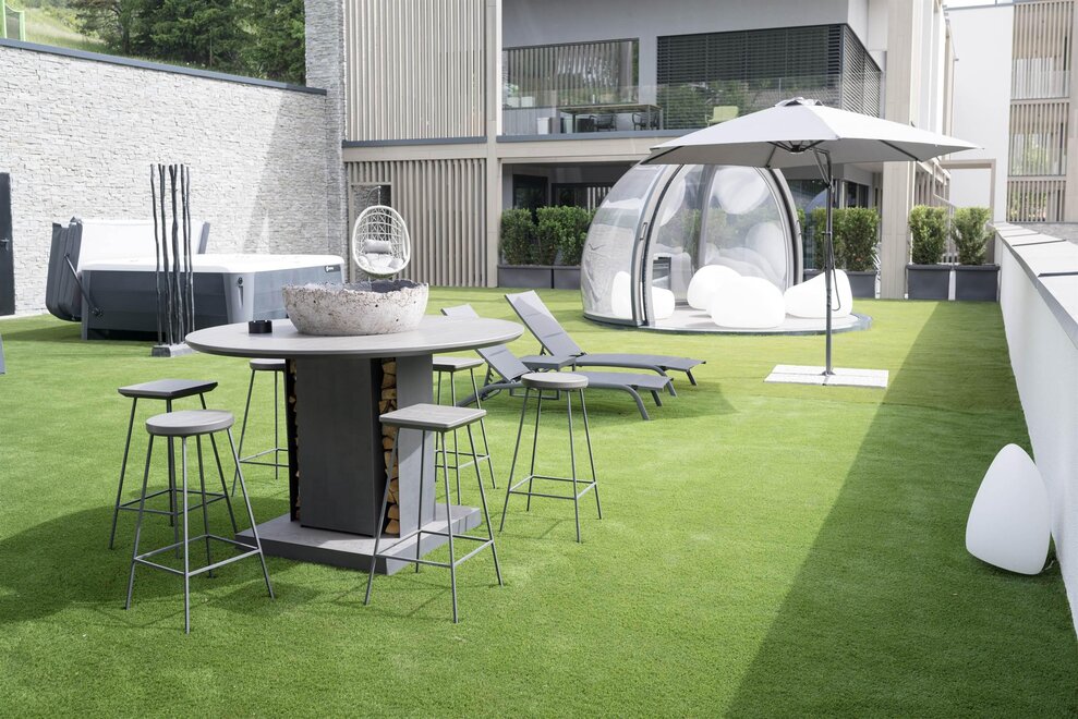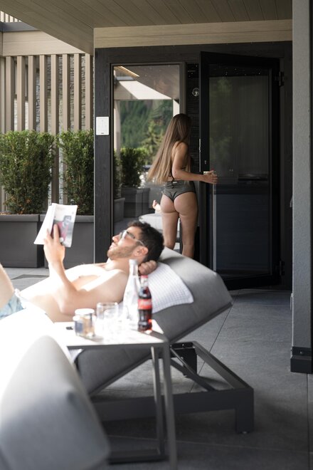 South-East facing terrace equipped with sun loungers and sitting area