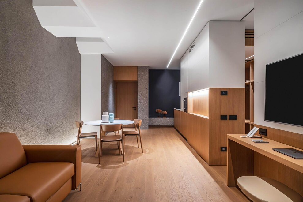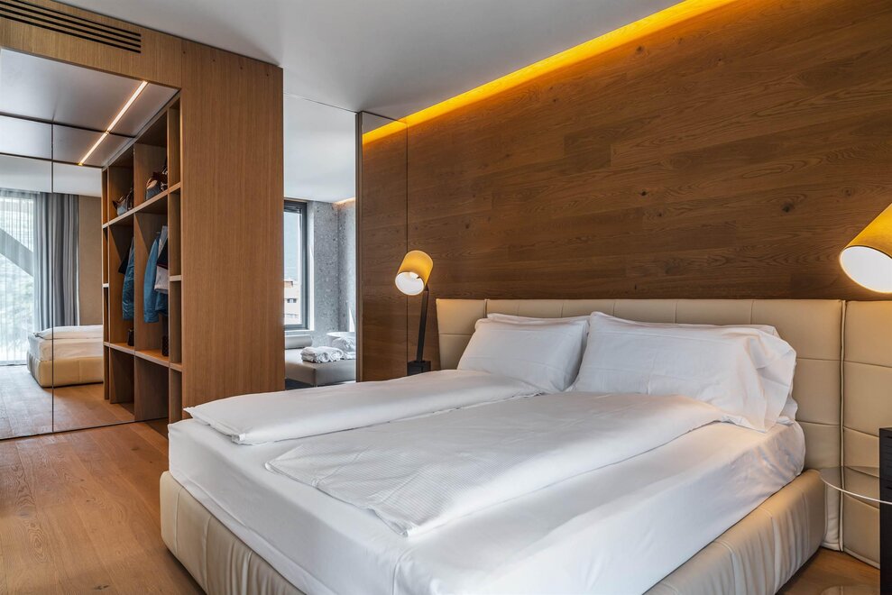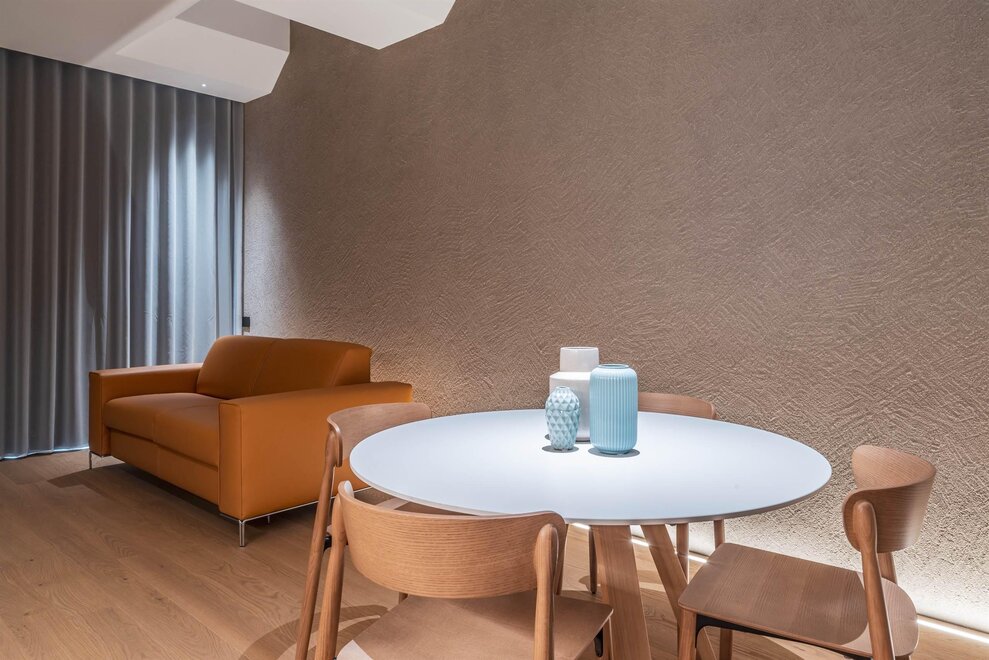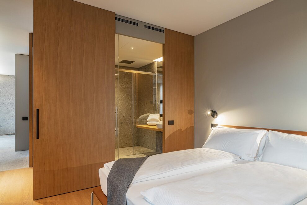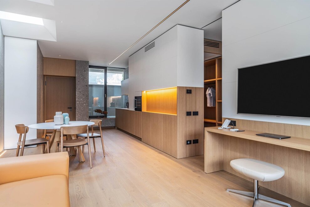 The interiors of La Rocchetta Studio feature extraordinary design elements such as the lighting created by Davide Groppi, with the revolutionary ''Infiniti" and ''Nulla" systems. The crowning highlight: the warm parquet flooring in the sleeping area made with Swiss organic wood.