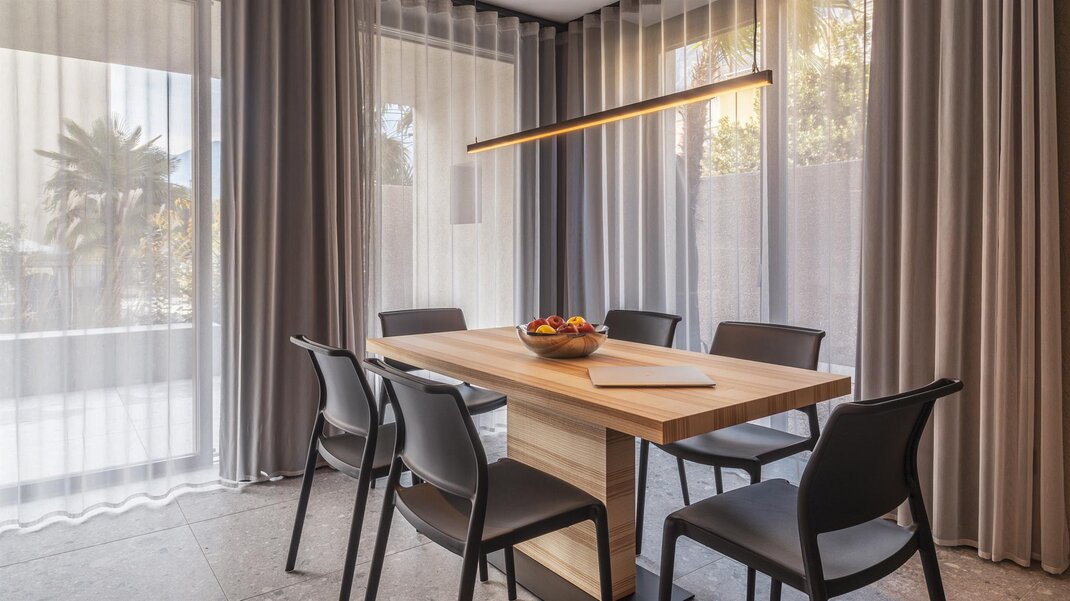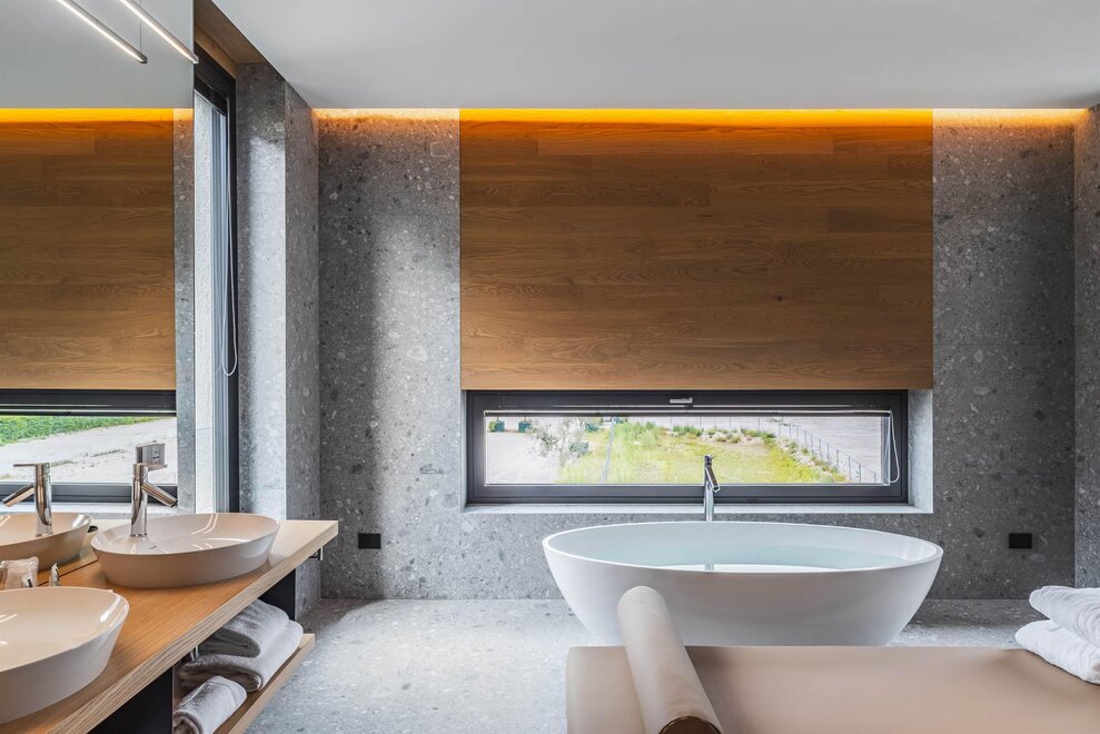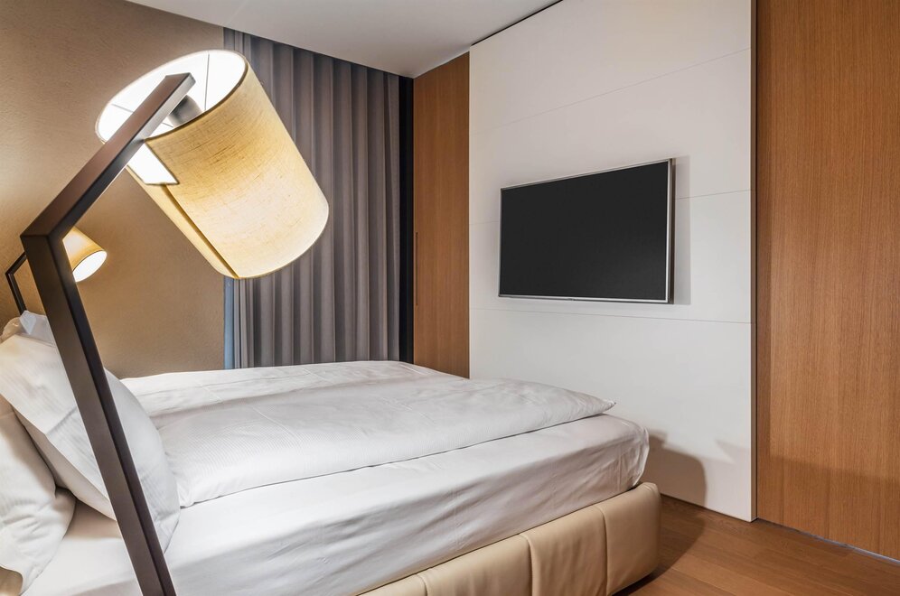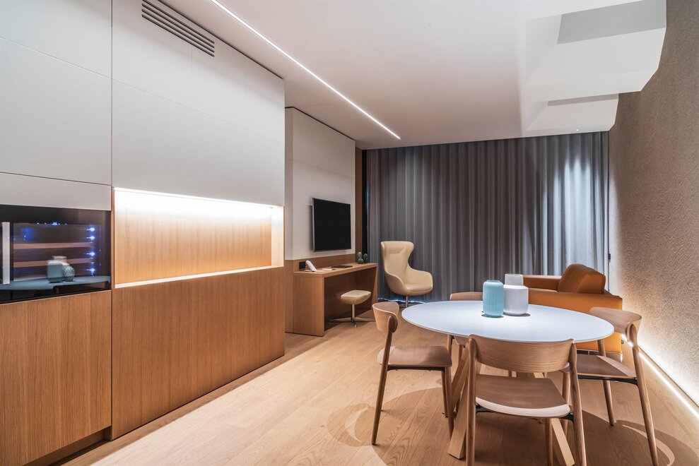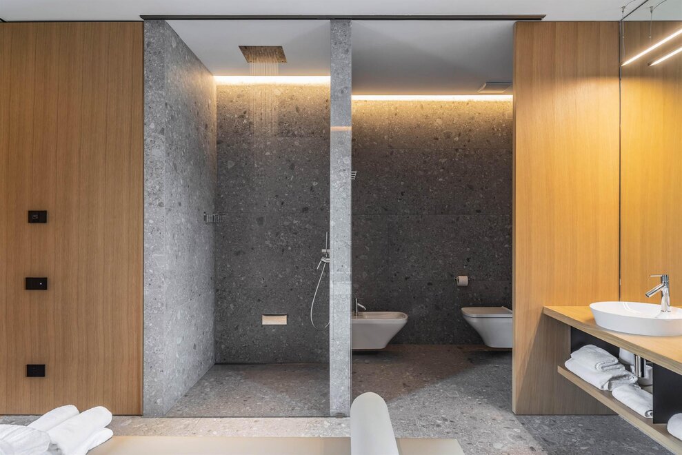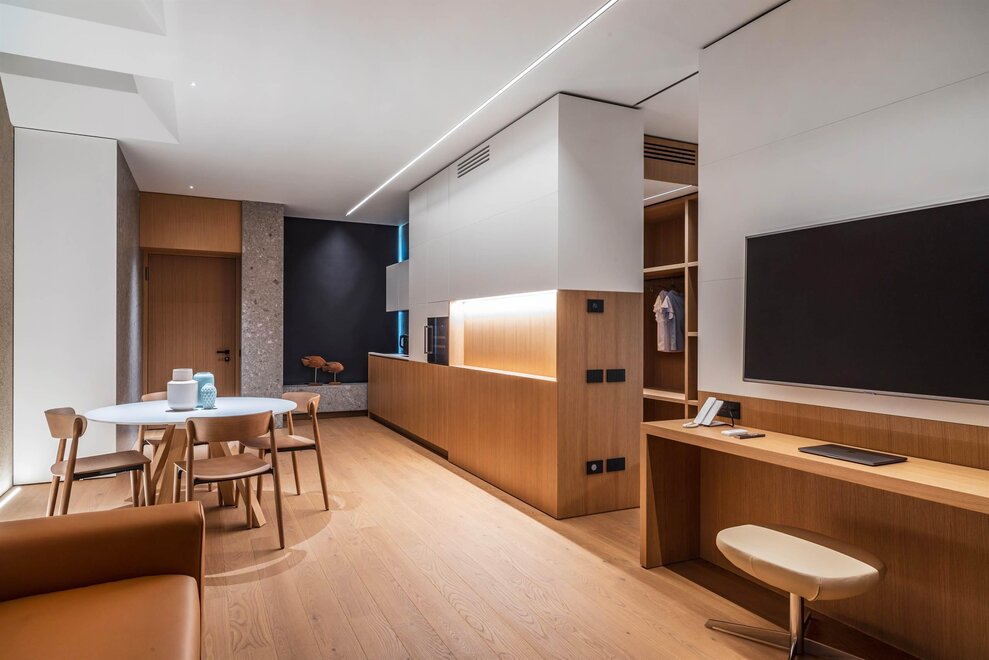 There is an elegant minimal design and a harmonious geometry that add a touch of sophistication to the accents. To complete the picture, exceptional services and a large bathroom with waterfall shower.