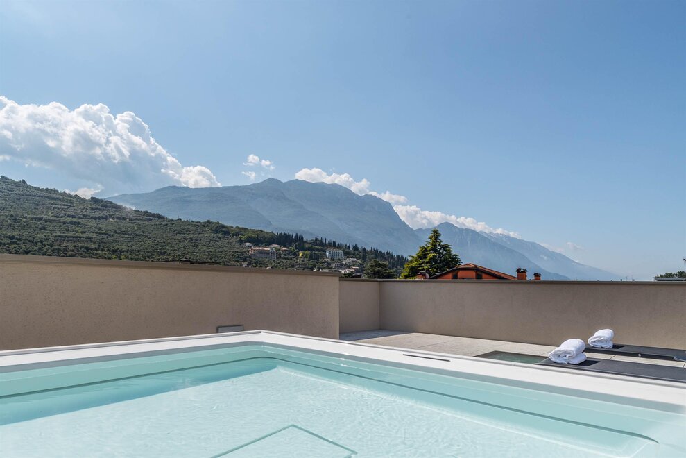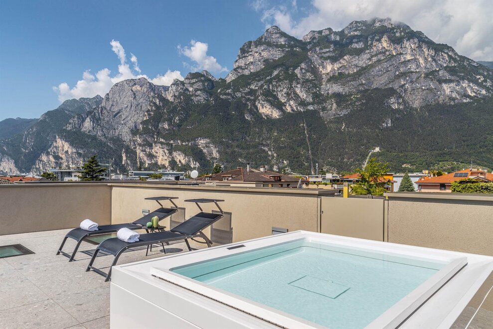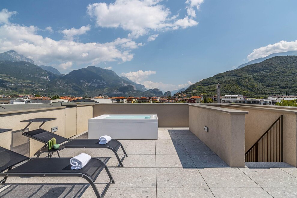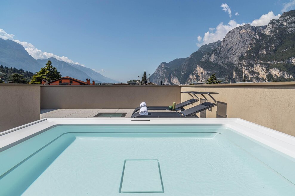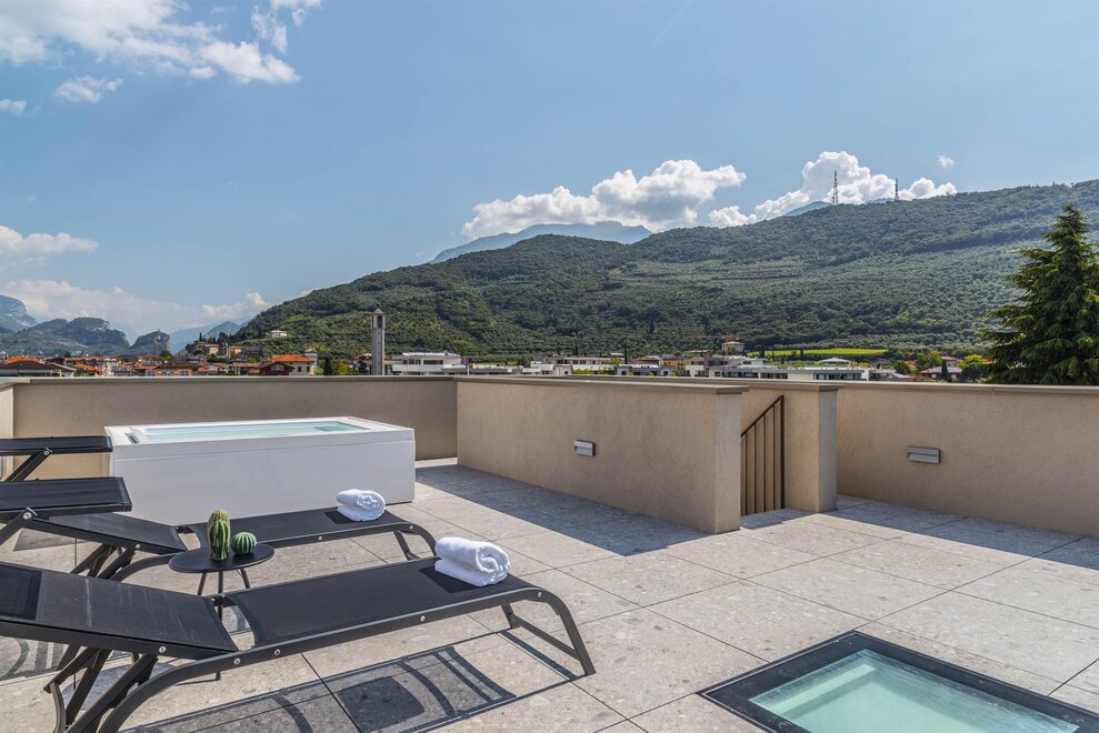To complete the tableau, an evocative terrace with exclusive access to the roof solarium, featuring a Treesse Fusion mini infinity pool with whirlpool and chaise longue. Immersed in the sweet embrace of hot water, you can enjoy an unforgettable 360° view of Riva del Garda framed by the mountains.