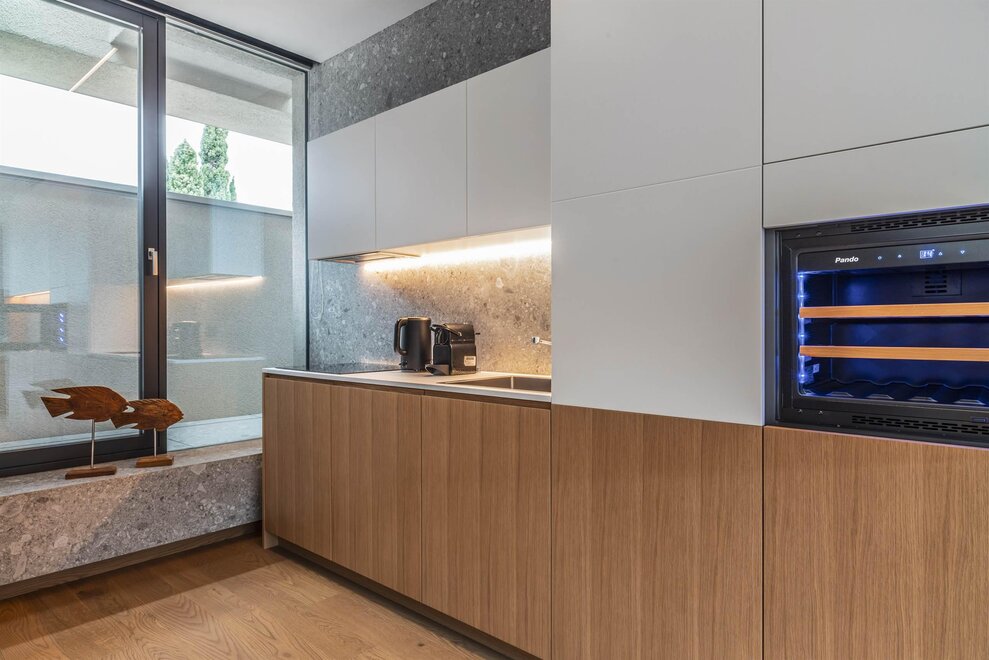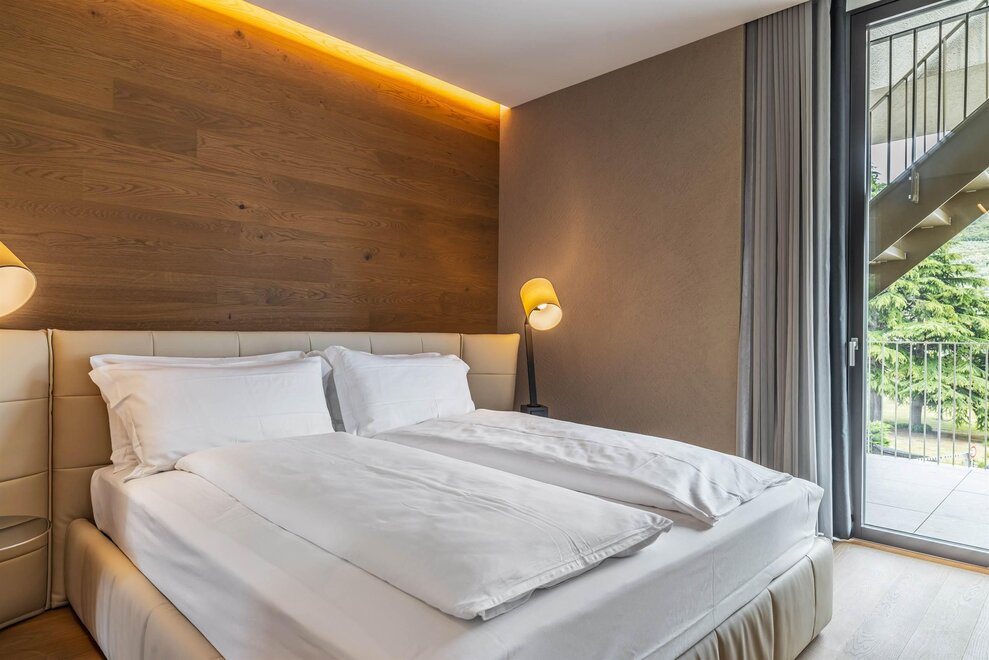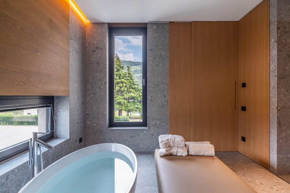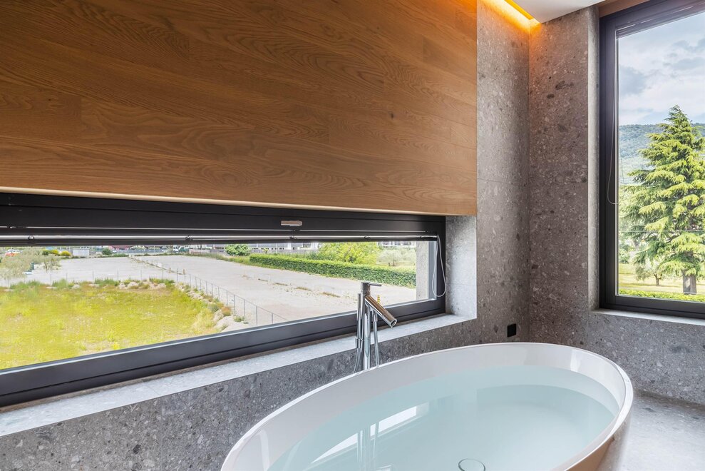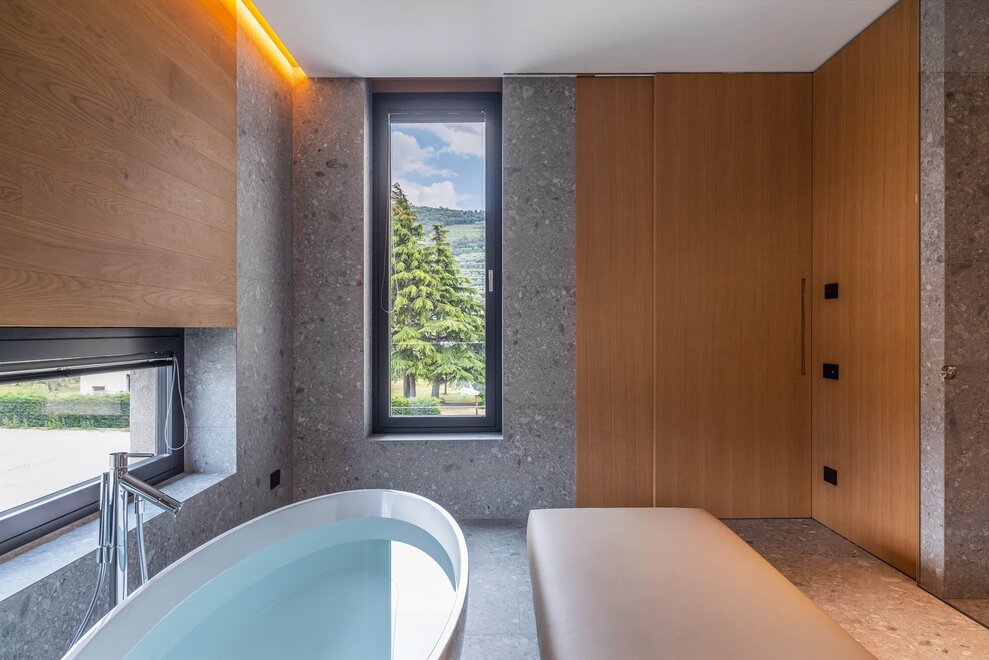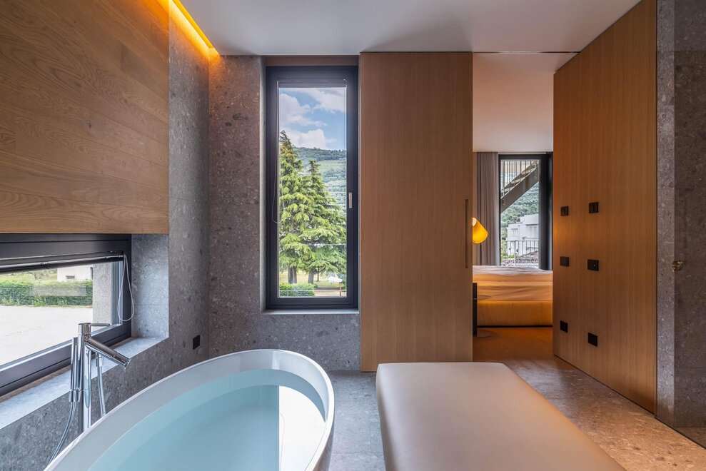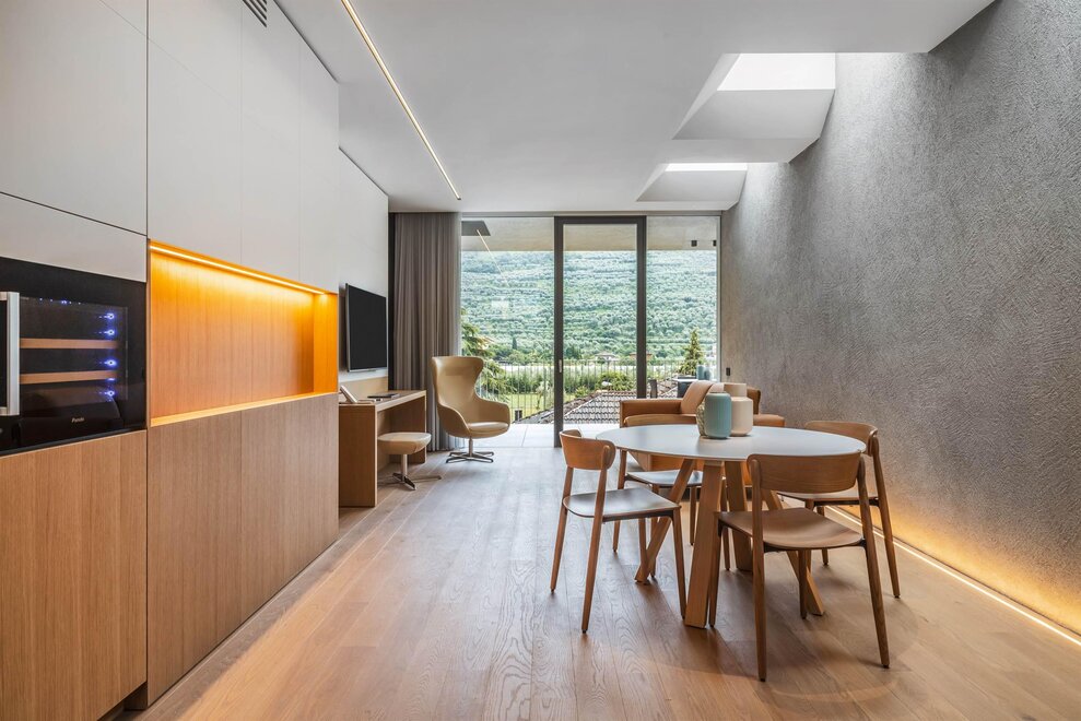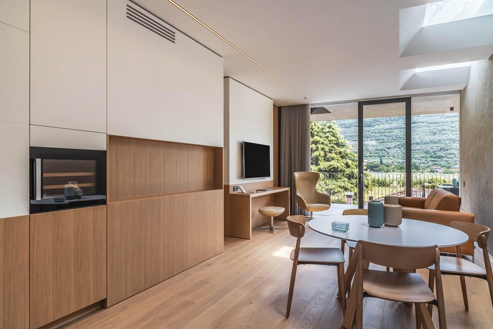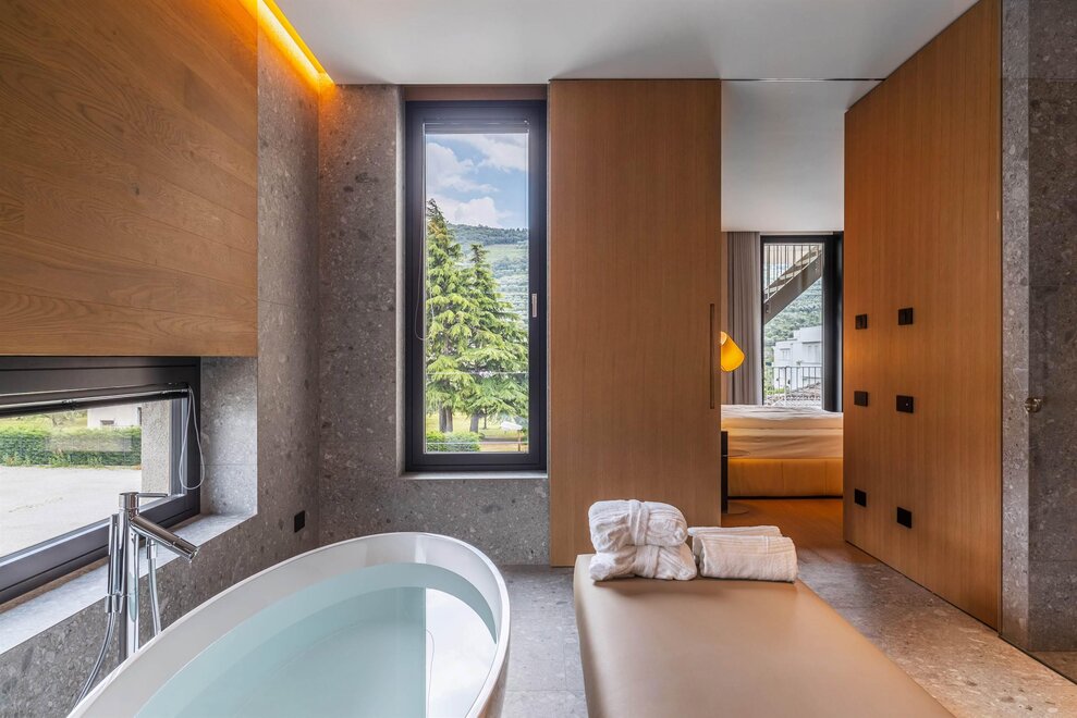 In the interior, the olive ash wood, typical of the Garda area, is perfectly combined with the more intense nuances of the stoneware used for the bathroom. To top it all off, state-of-the-art appliances, independent air-conditioning in every room and perfect soundproofing throughout.