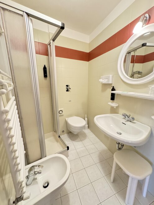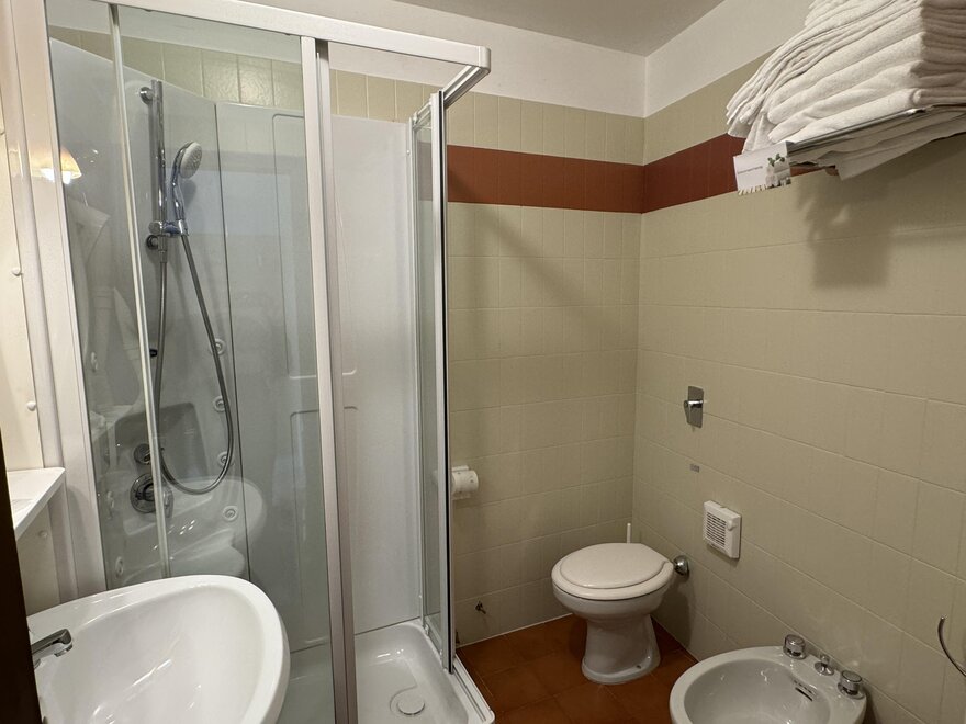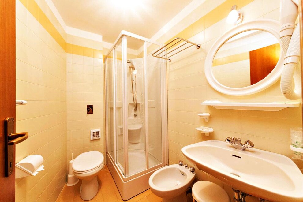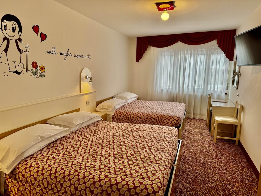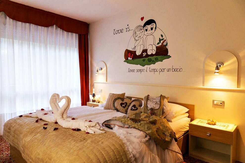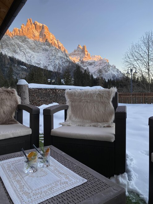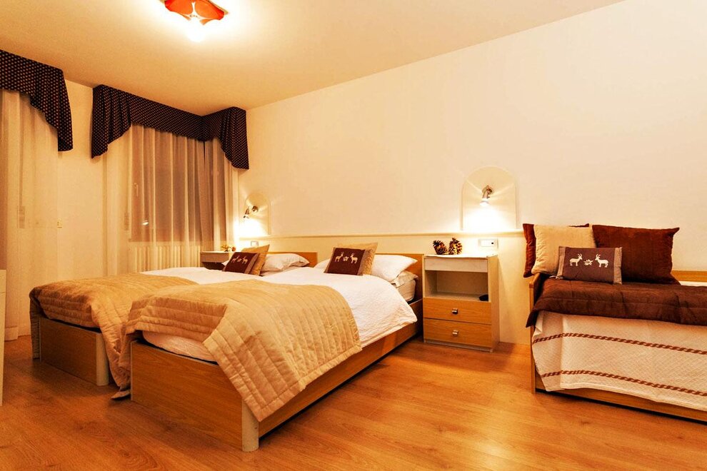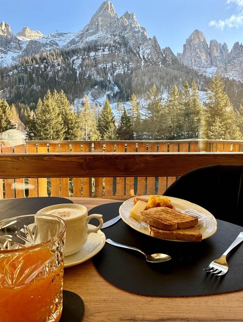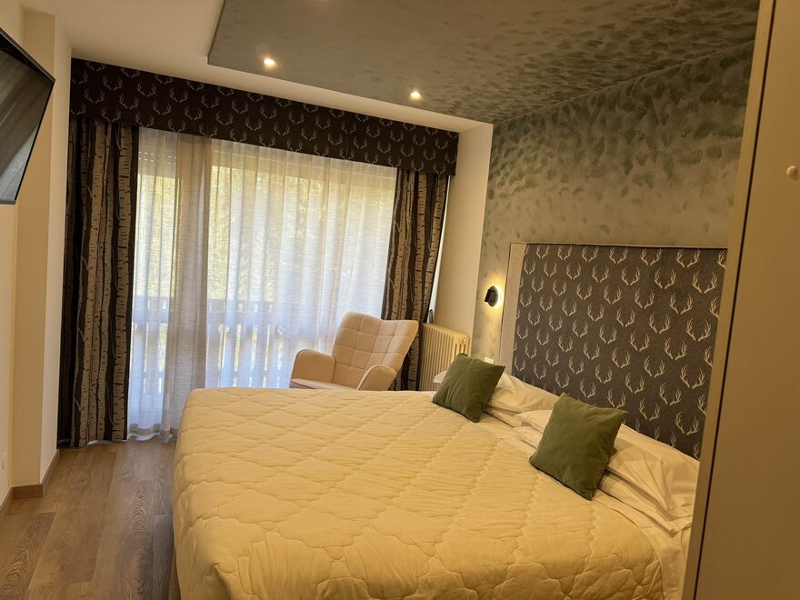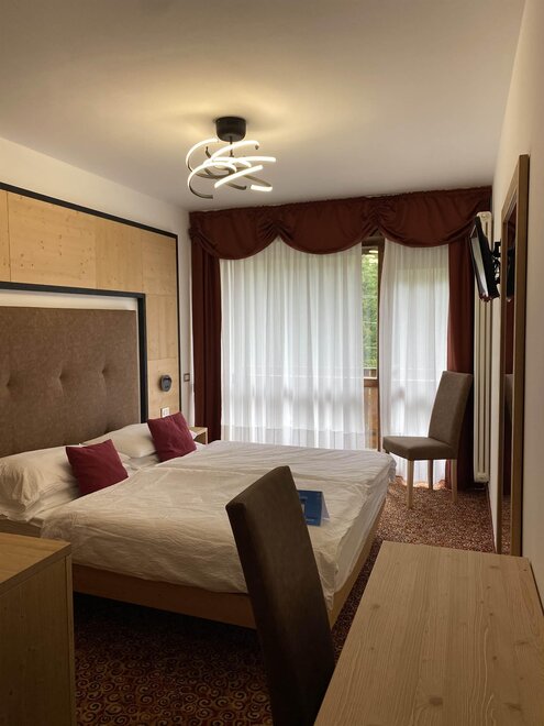 Double Room With Possibility of Twin, Enchanting Panoramic View of the Pale di San Martino, With Private Bath and Shower, Equipped with a combination of Safe, Hair dryer and TV Color-Screen TV, Three variants are available: Only Window, Balcony and Direct Access On Terrace Solarium.
