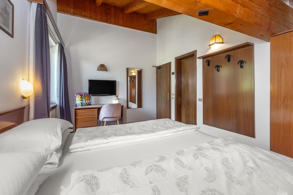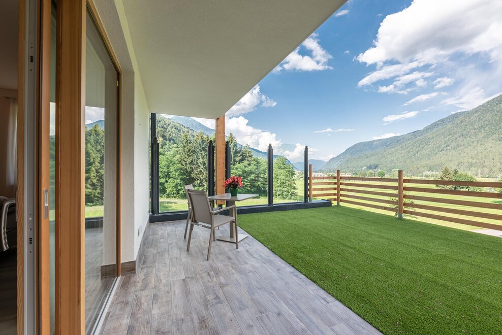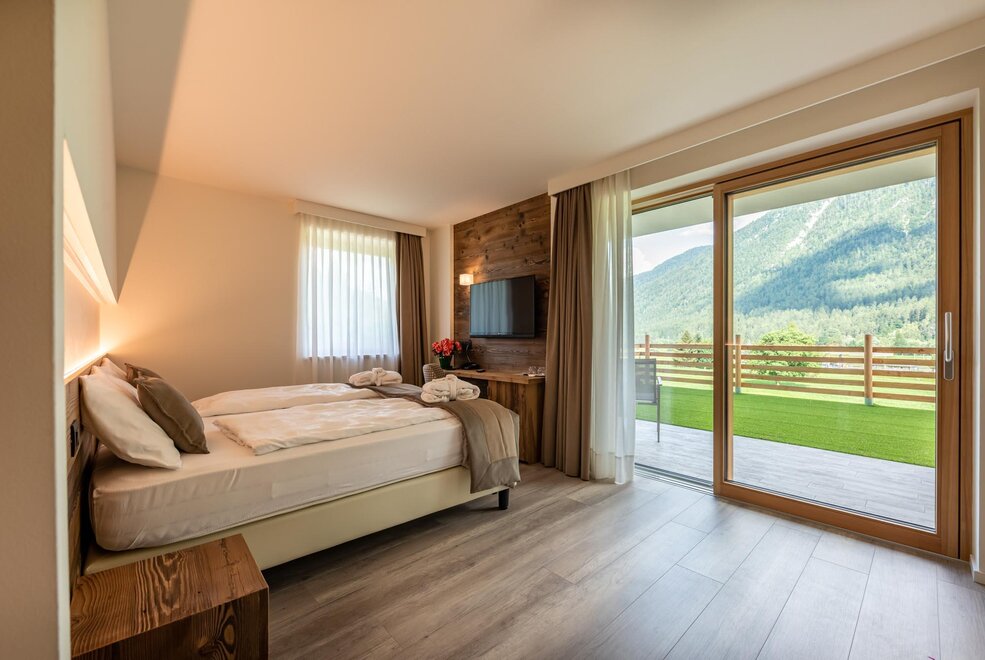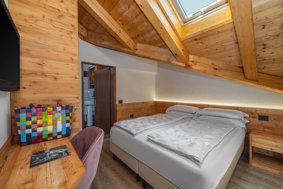 Spacious and panoramic new rooms with natural larch wood furniture ranging from new to antique, wooden floor and large balcony.