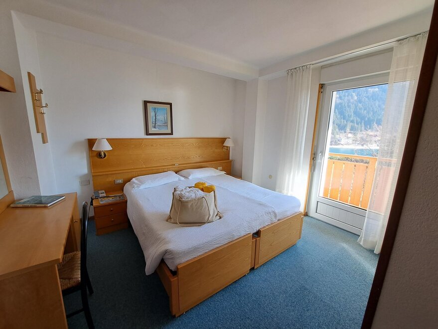 Spacious and bright room designed for couples or families with small children, featuring a balcony with a front or side view of Lake Molveno. Immerse yourself in the warm atmosphere created by the fir wood furnishings and admire the magnificent view from the sunny balcony.
