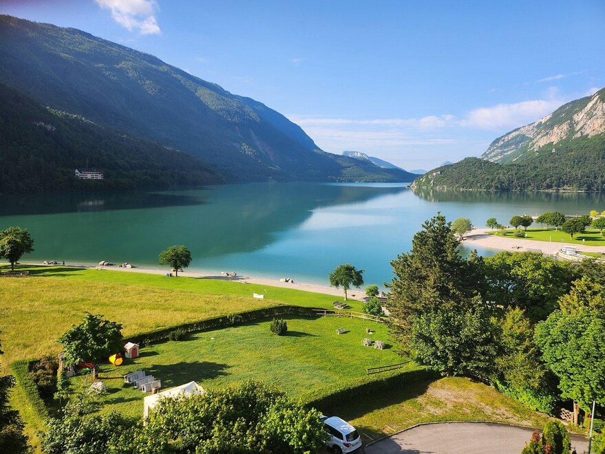 Spacious and bright room designed for couples or families with small children, with balcony with front or side view of Lake Molveno. Immerse yourself in the warm atmosphere created by the fir-wood furnishings and admire the magnificent view from the sunny balcony.