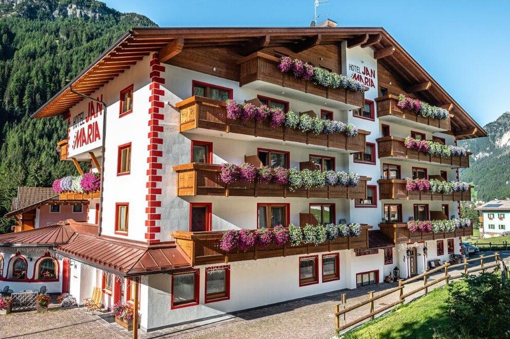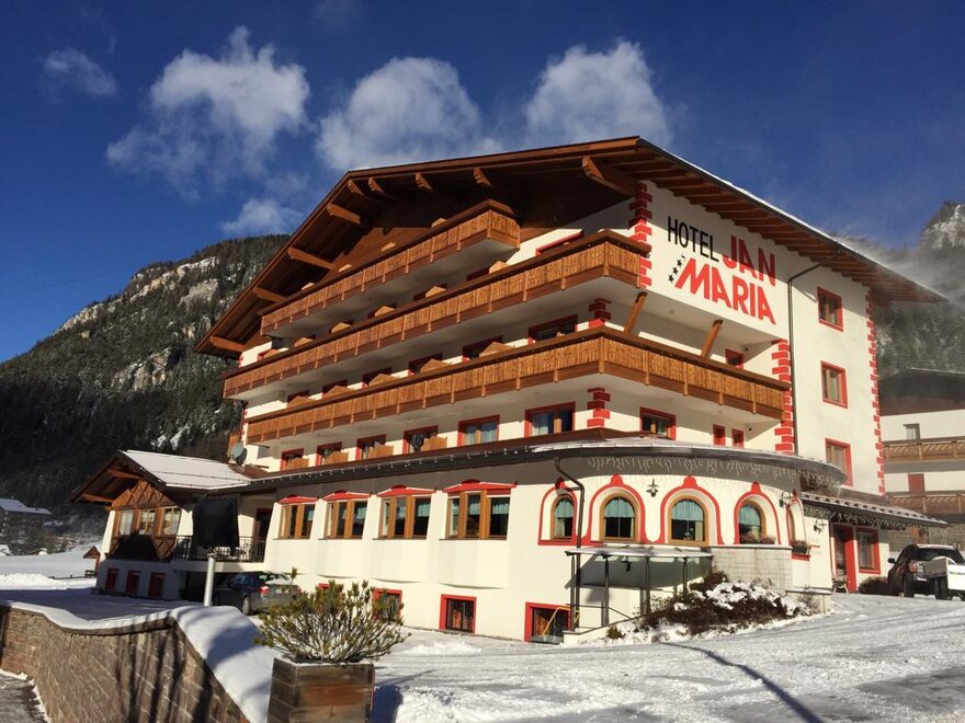 The hotel is situated 500mt from the centre of Canazei (an 8 minute walk) and 800mt from the bottom of the Belvedere funicular (a 12 minute walk), which in winter takes you directly to the ski resort Sellaronda, in the Dolomiti Superski area, whereas in summer it is the start of many scenic hiking trails. In winter we offer a free stuttle bus to the ski centres in Canazei. Our hotel is situated in a peaceful, sunny area in the centre, but at the same time away from the traffic, the ideal place for a wonderful summer or winter holiday. The hotel was built and opened in 1981 and has always been run by the Fosco family. Over the years various modernisations and improvements have been made in order to keep up with the times and the needs of the guests. The Hotel Jan Maria in Canazei, in Val di Fassa, offers a magnificent view of the Dolomites in the Trentino region. These mountains are a Unesco Heritage Site.