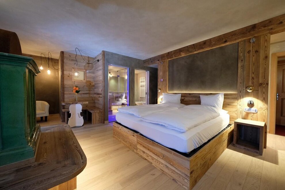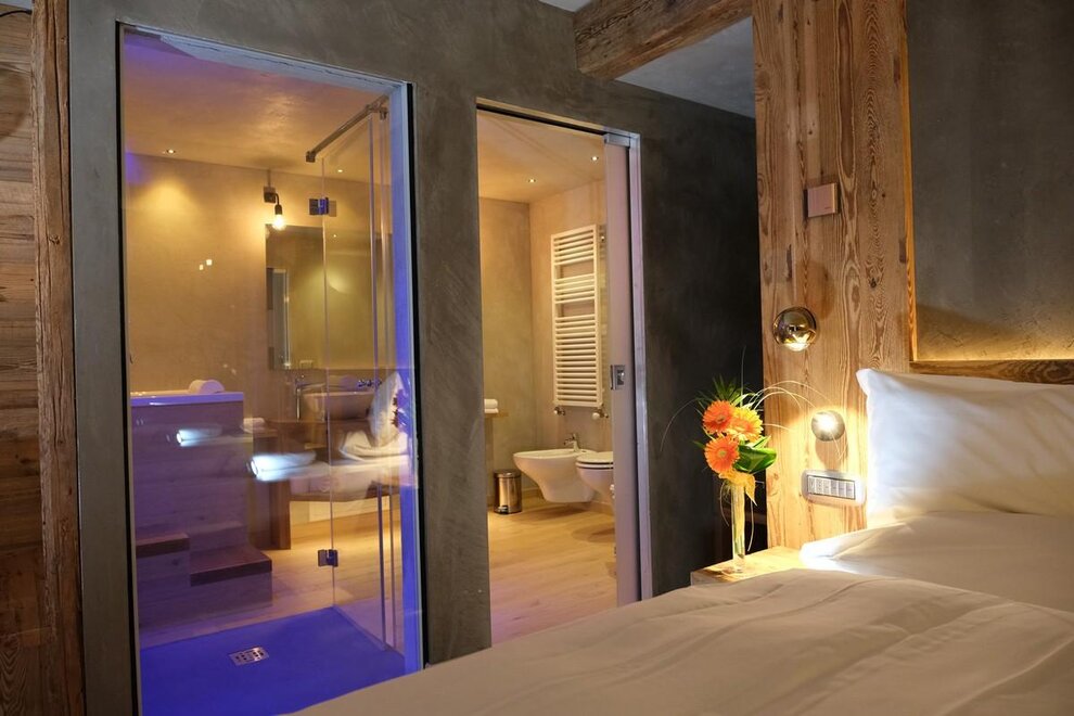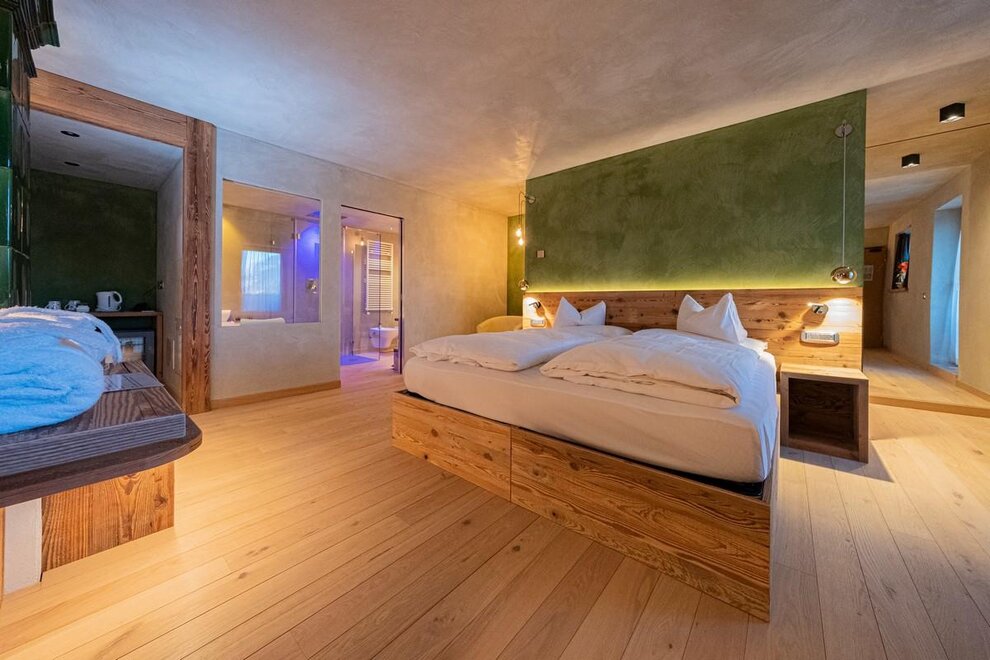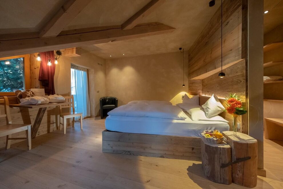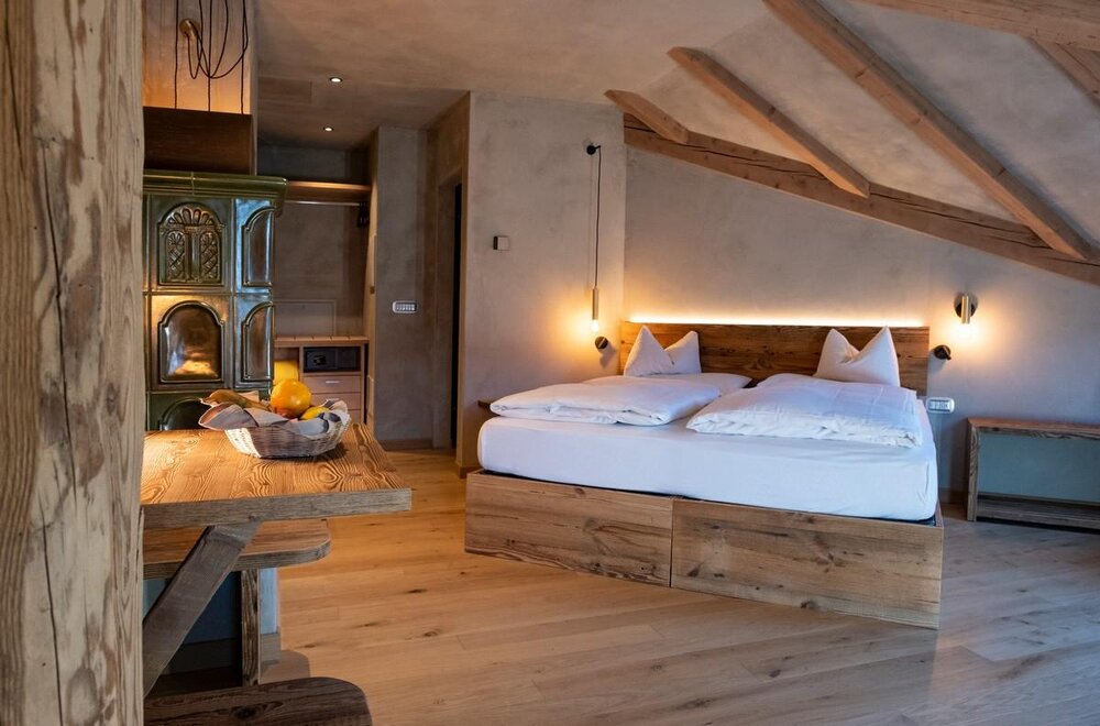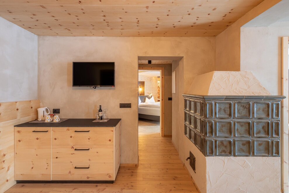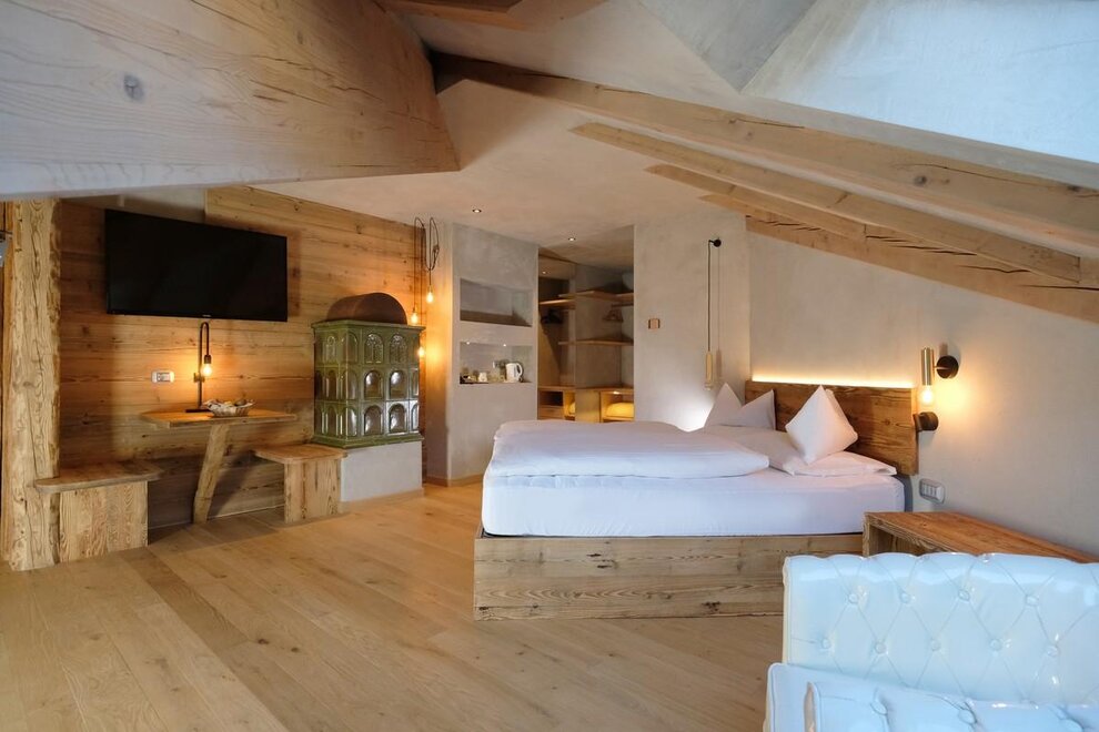 Occupancy: 2 personsA most charming Junior Suite of 40 m2 with floors and furniture made of wood and an original “Stufa a ole” – a typical traditional ceramic wood stove to let you breath the mountain life.