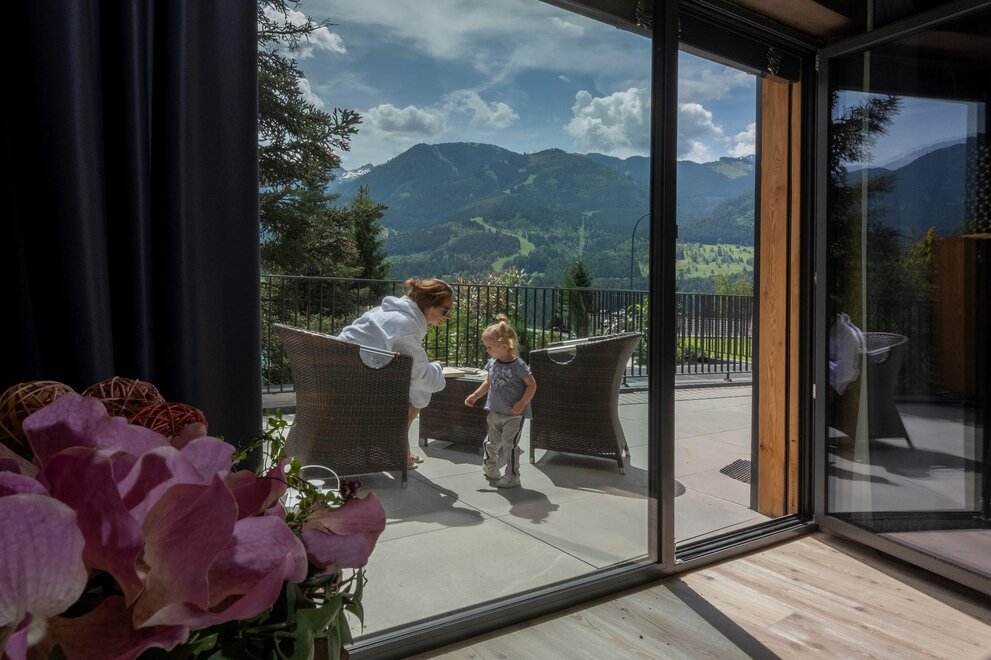An amazing and comfortable Junior Suite of 70 m2 with a large terrace where you can enjoy a marvellous view of the Dolomites and the Lagorai Chain sipping a glass of wine…