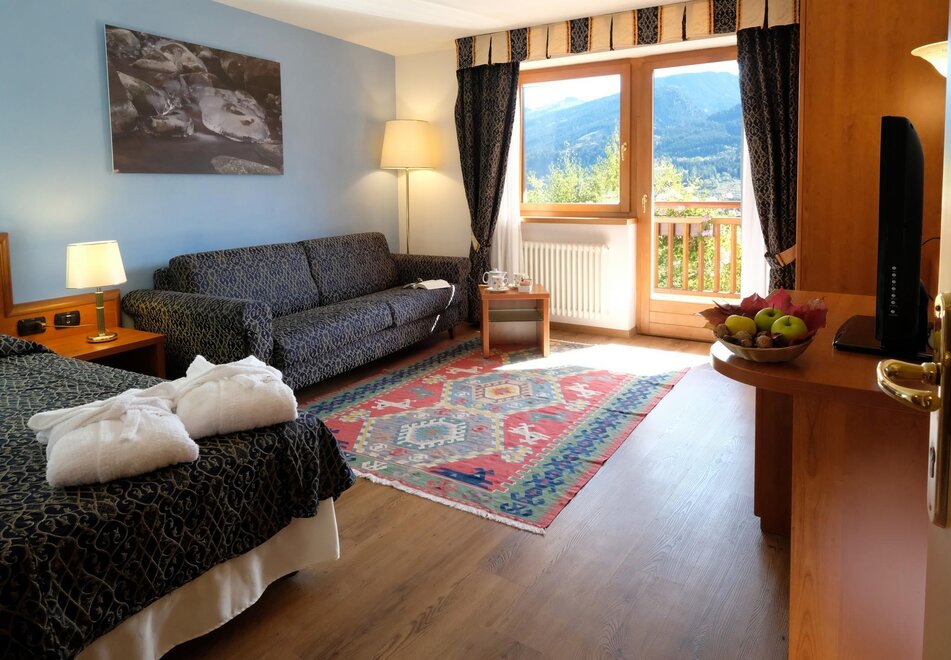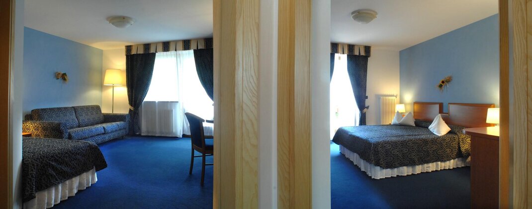 Comfortable junior suite ideal for families or couples. Contains furniture made of spruce and pine. All with balcony with a partial view overlooking the valley. One is a loft in a typical mountain style. Two have barrier-free access for wheelchair Equipment: moquette, shower, hairdryer, radio, satellite TV with 6 Sky channels, mini-bar, wall safe, telephone, and balcony. Size: 28-30 square meters + bathroom Occupation: max 4 people: 2/3/4 adults or 2/3 adults + 1/2 children