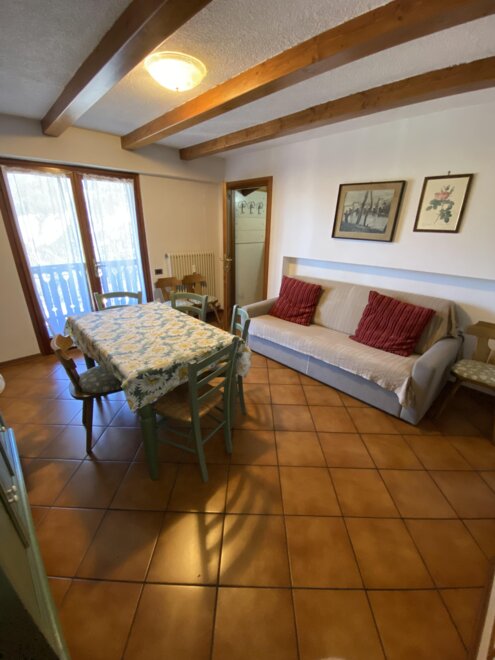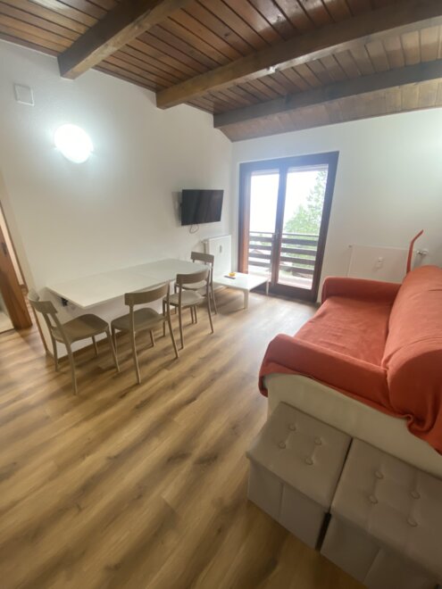 Apartment with a large terrace offering a beautiful view of Sasso Rosso, living room with a double sofa bed and two spots in two sofa beds with a pull-out single bed with a partition. Separate kitchenette. Bathroom with bathtub.