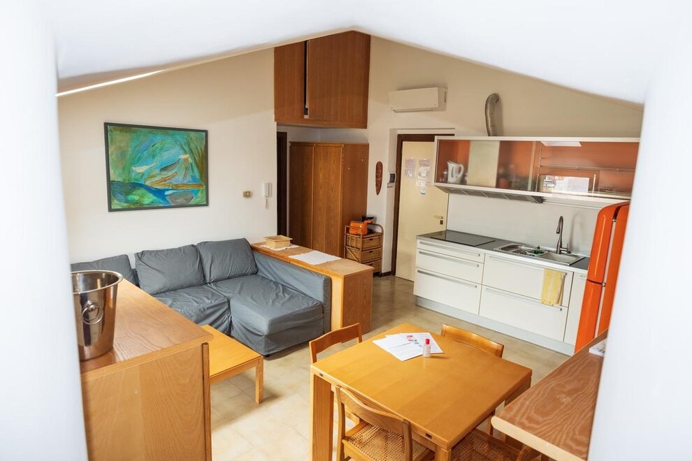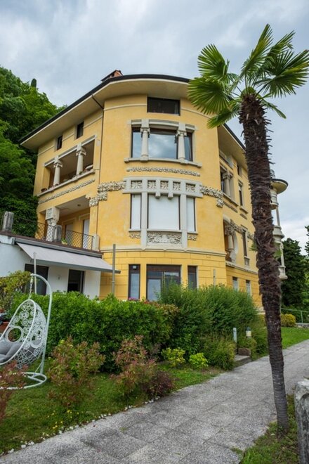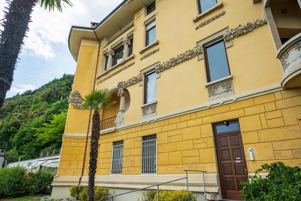 The Lake Attic Apartment is located on the top floor (accessible by elevator) of Villa Lina, a liberty-style heritage-listed building, and has recently undergone renovation. Finely furnished and fully equipped (dishwasher, washing machine, air conditioning, Wi-Fi, hairdryer, kitchen accessories, etc.), it consists of a spacious living room with a modern open kitchen, extendable table, and a large comfortable sofa with a facing coffee table. It has a bedroom, a bathroom with a shower, and a delightful turret (an architectural element typical of liberty style), accessible from the living room, with a circular bench and a table for breakfasts, breaks, and romantic dinners.